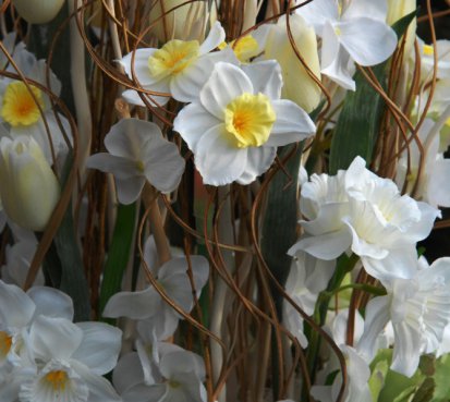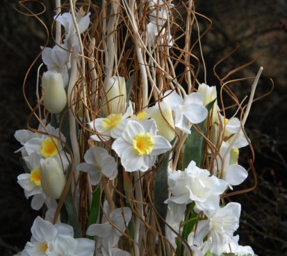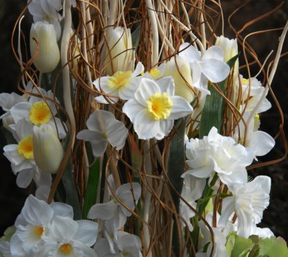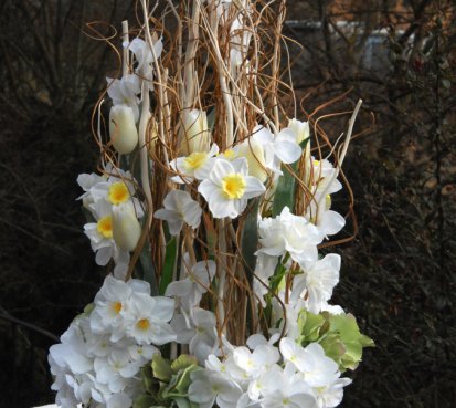 Přírodní proutěný koš je naaranžován nádhernými umělými květinami, proutky...krásná jarní dekorace do Vašeho domova