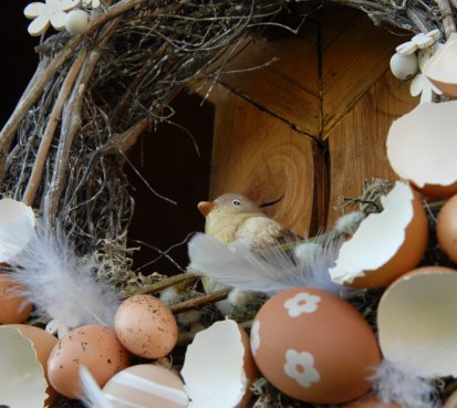 Proutěný korpus je bohatě ozdoben umělými dokonalými vajíčky, pravými skořápkami, peřím. Na vše dohlíží roztomilý keramický ptáček