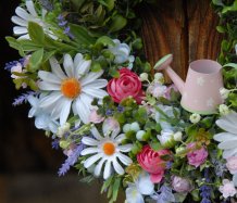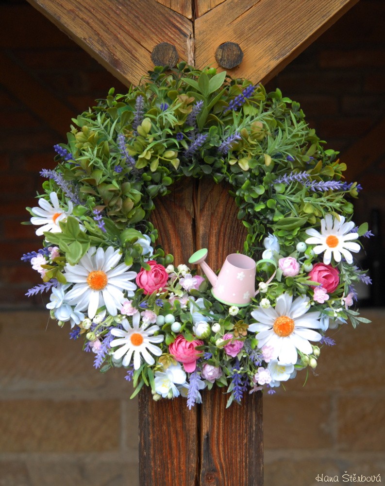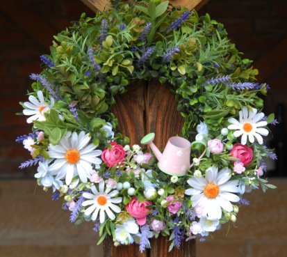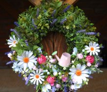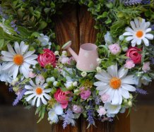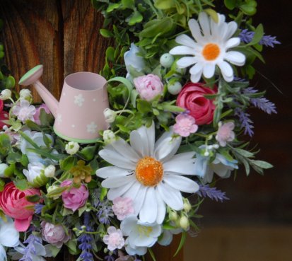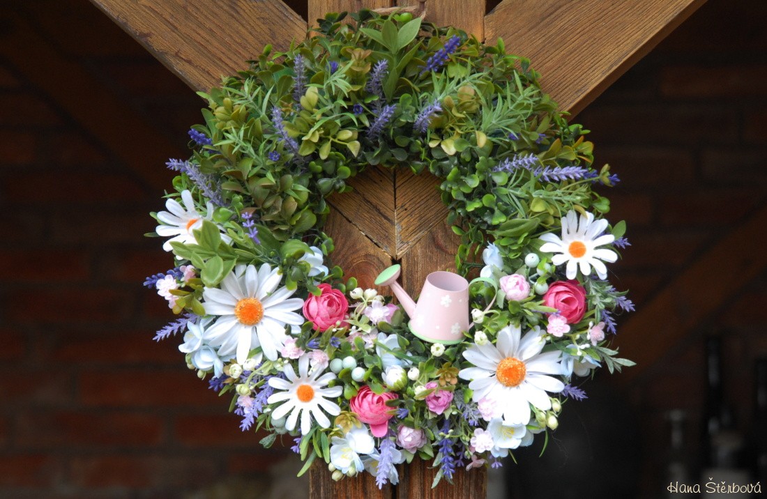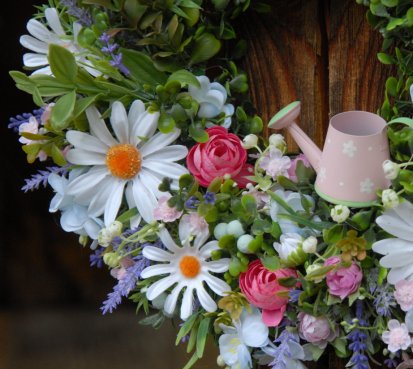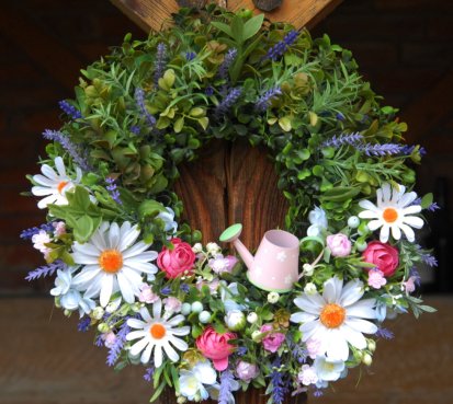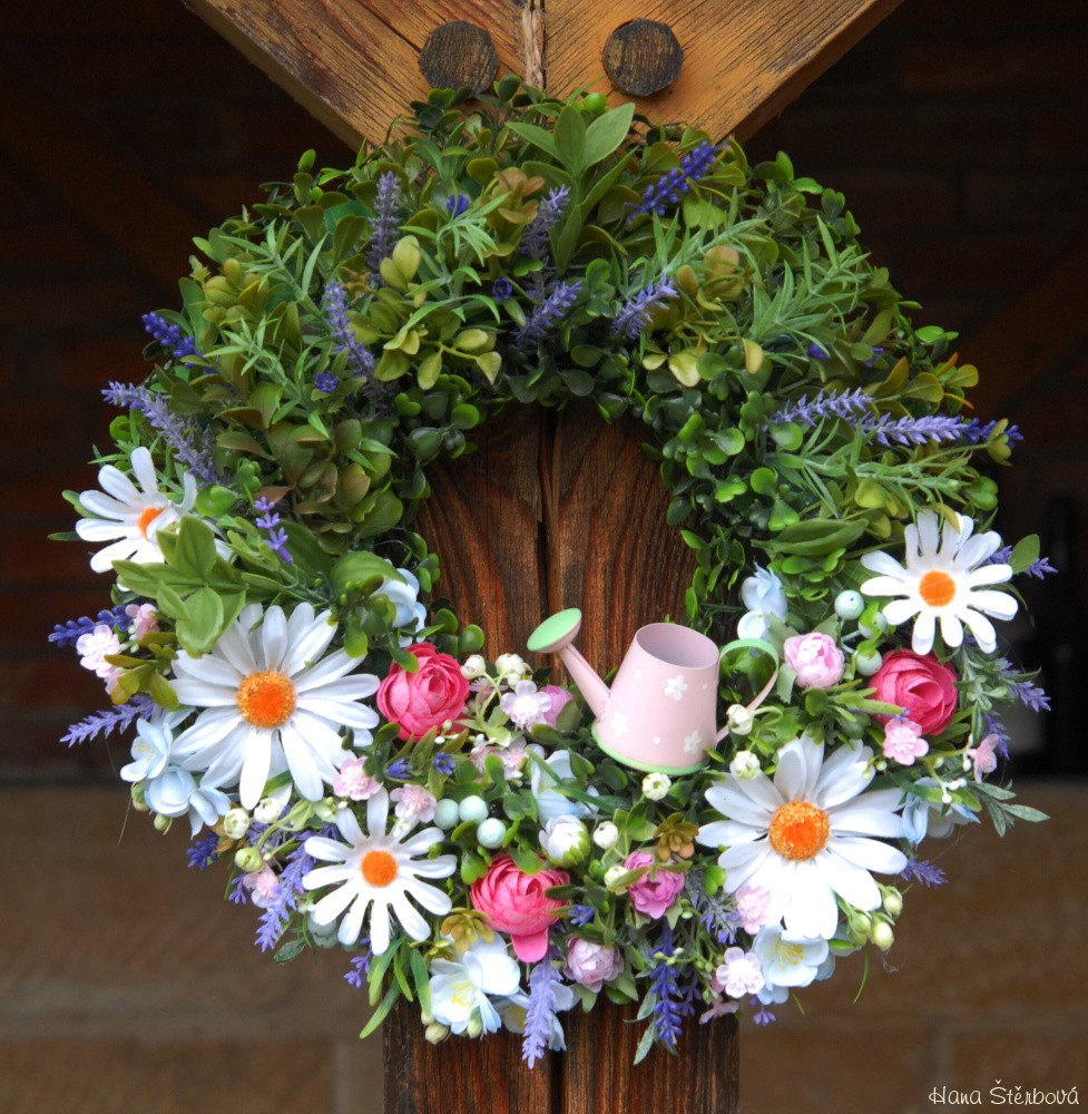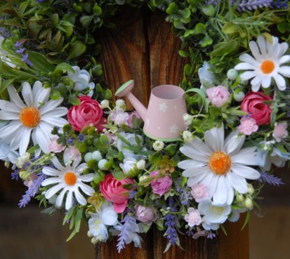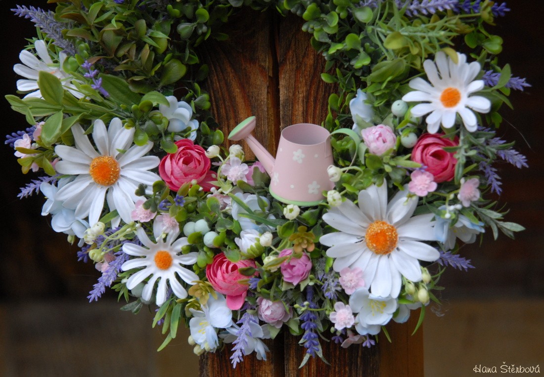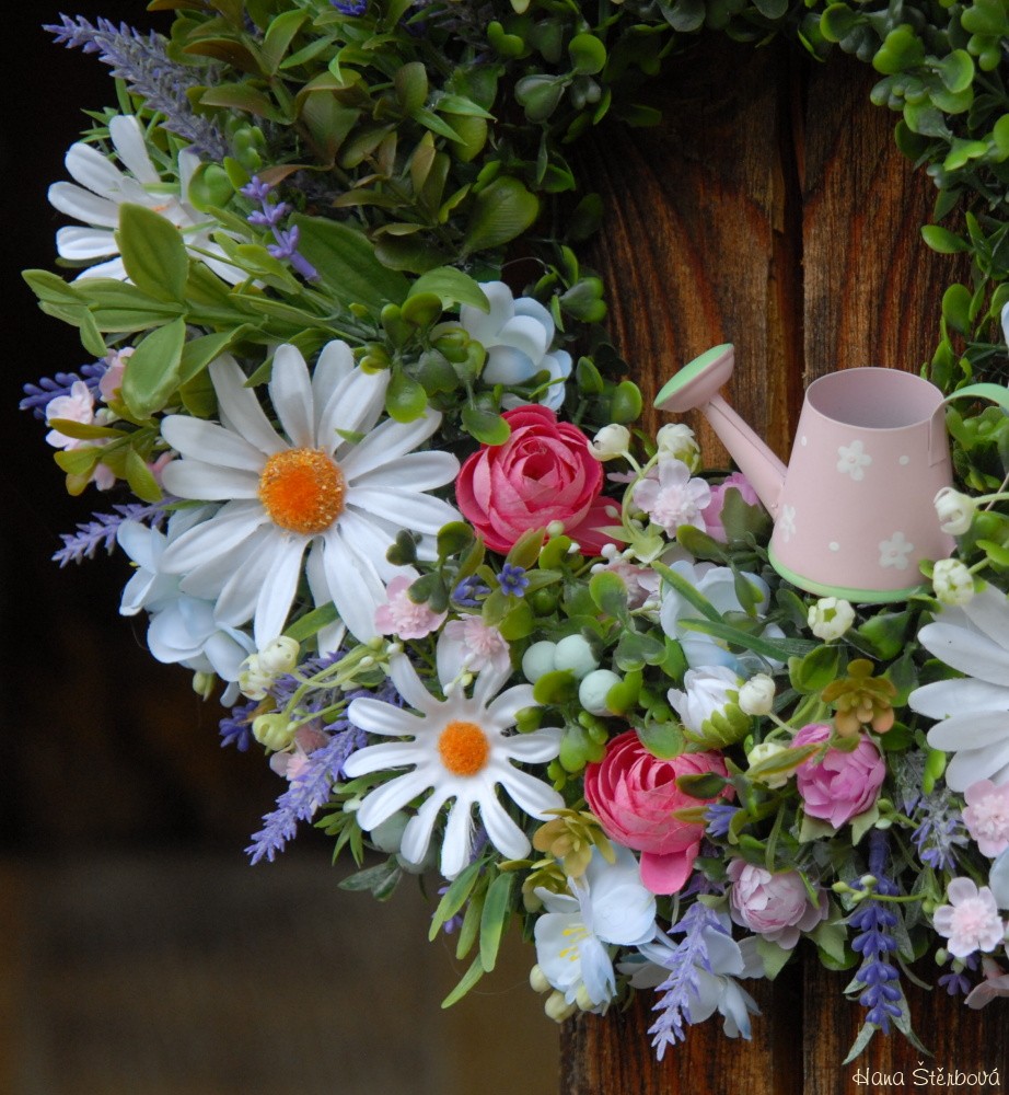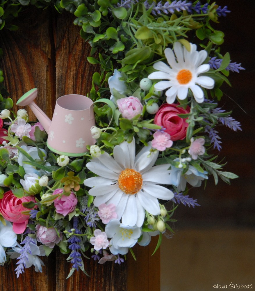 Bohatě zdobený věnec dokonalými umělými květinami ....plechová konvička k tomu
