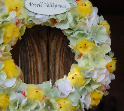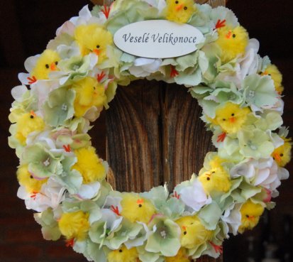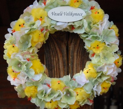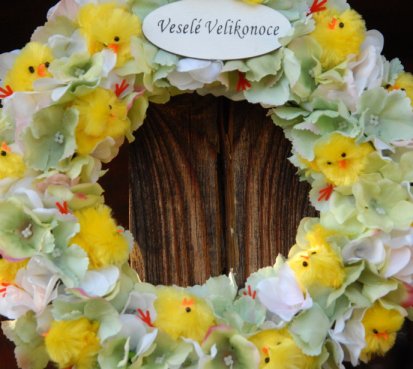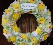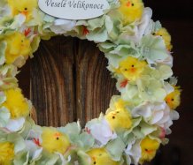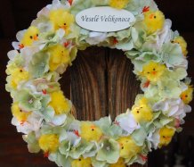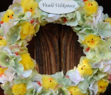 Věnec je vytvořen na pevném korpusu s dokonalými látkovými květinami a roztomilými kuřátky