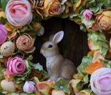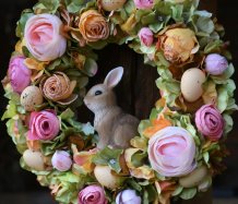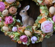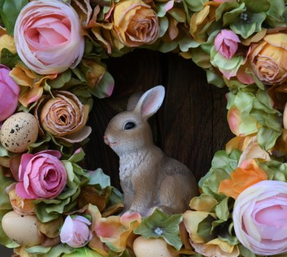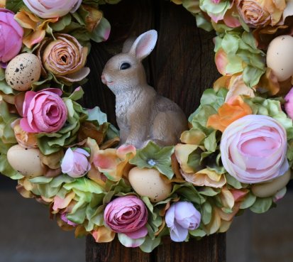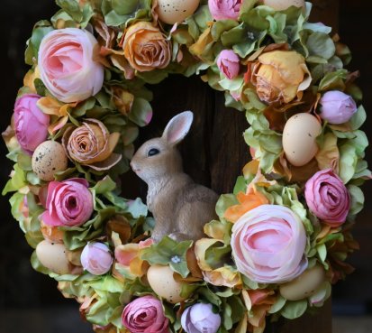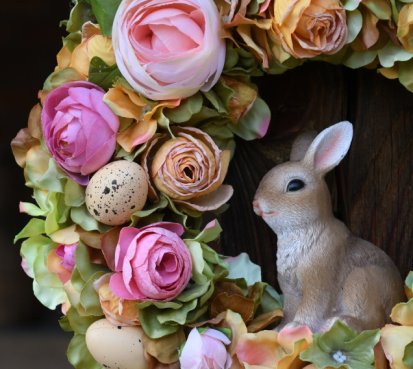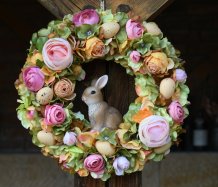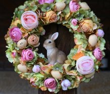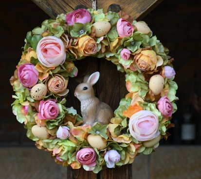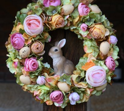 Bohatě zdobený věnec umělými květinami na pevném korpusu.....krásný zajíček k tomu