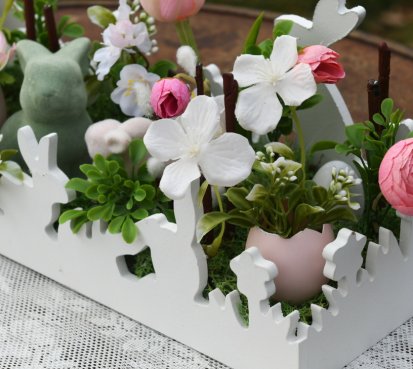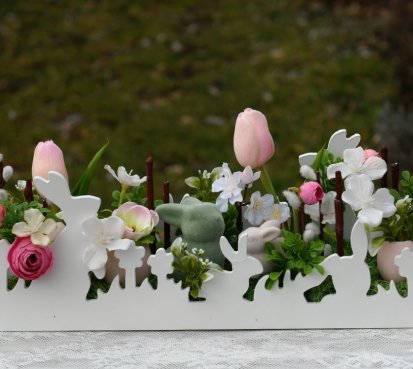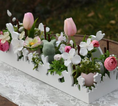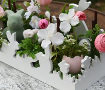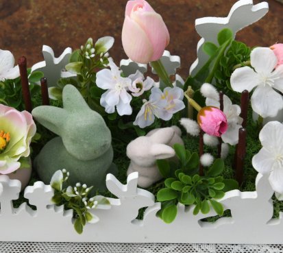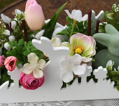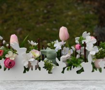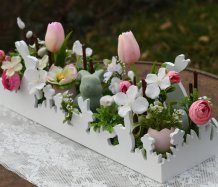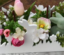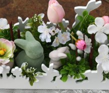 Dřevěný truhlík s jarními motivy je naplněn dokonalými umělými květinami, skořápkami...... a dva krásní zajíčci k tomu