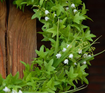 Krásný konvalinkový věnec z dokonalé umělé zeleně a konvalinek