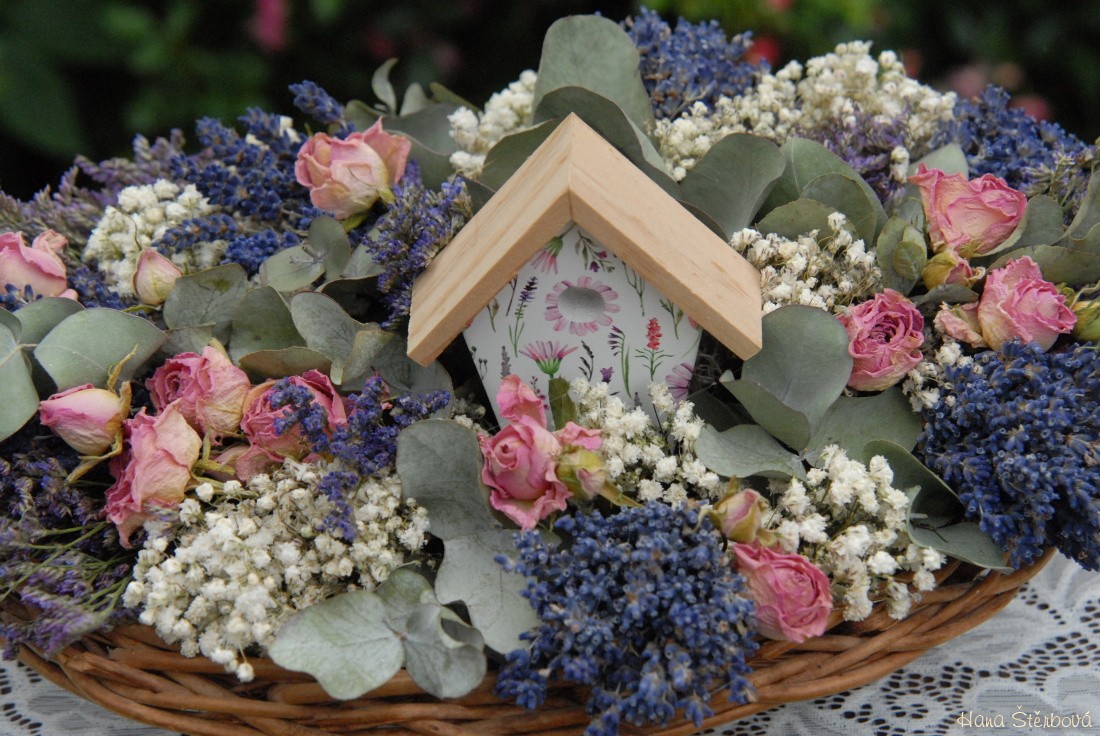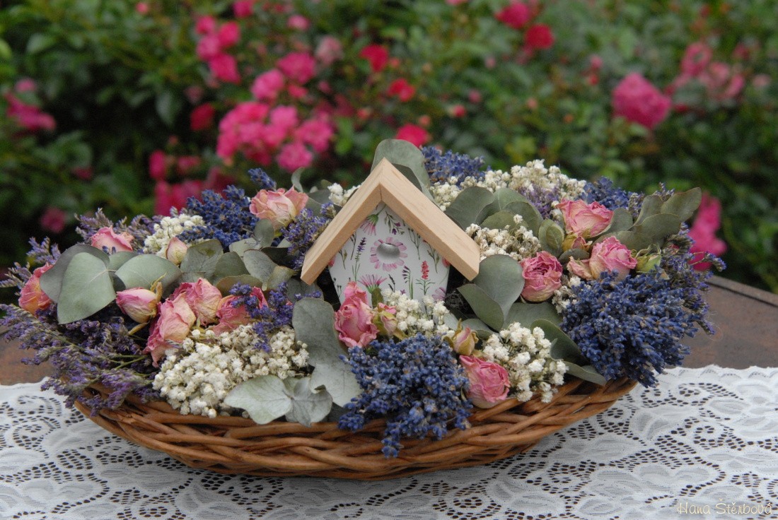 Košík je naplněn voňavými sušenými květinami, krásná dřevěná budka k tomu
