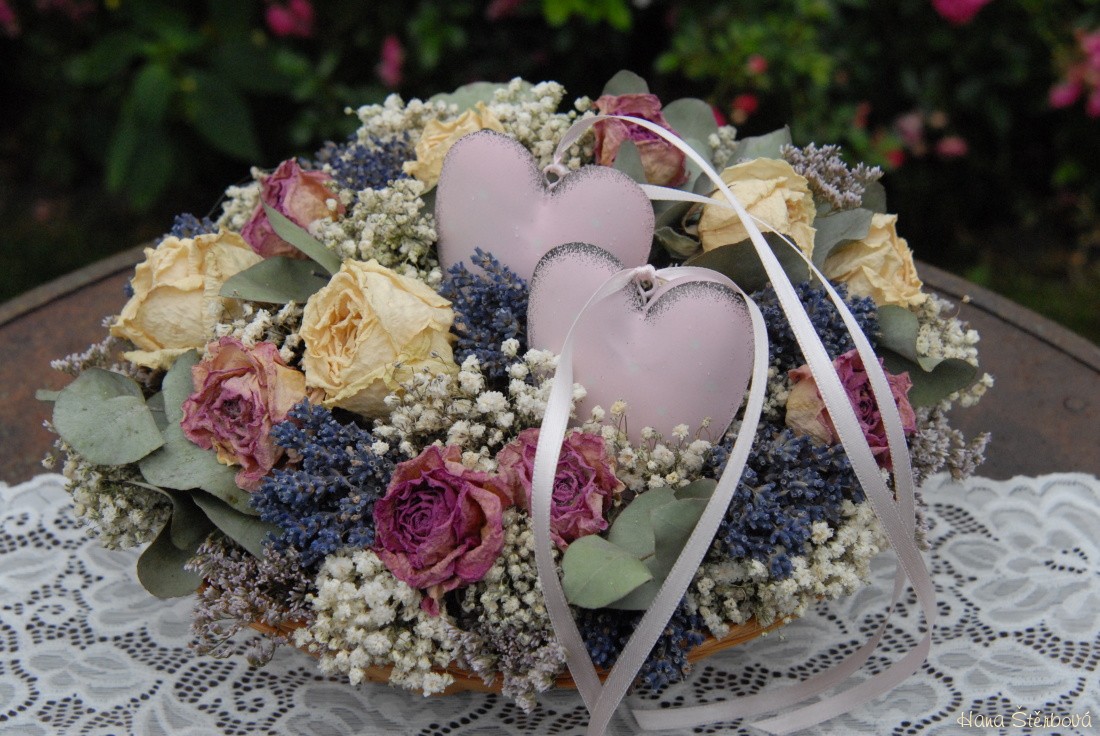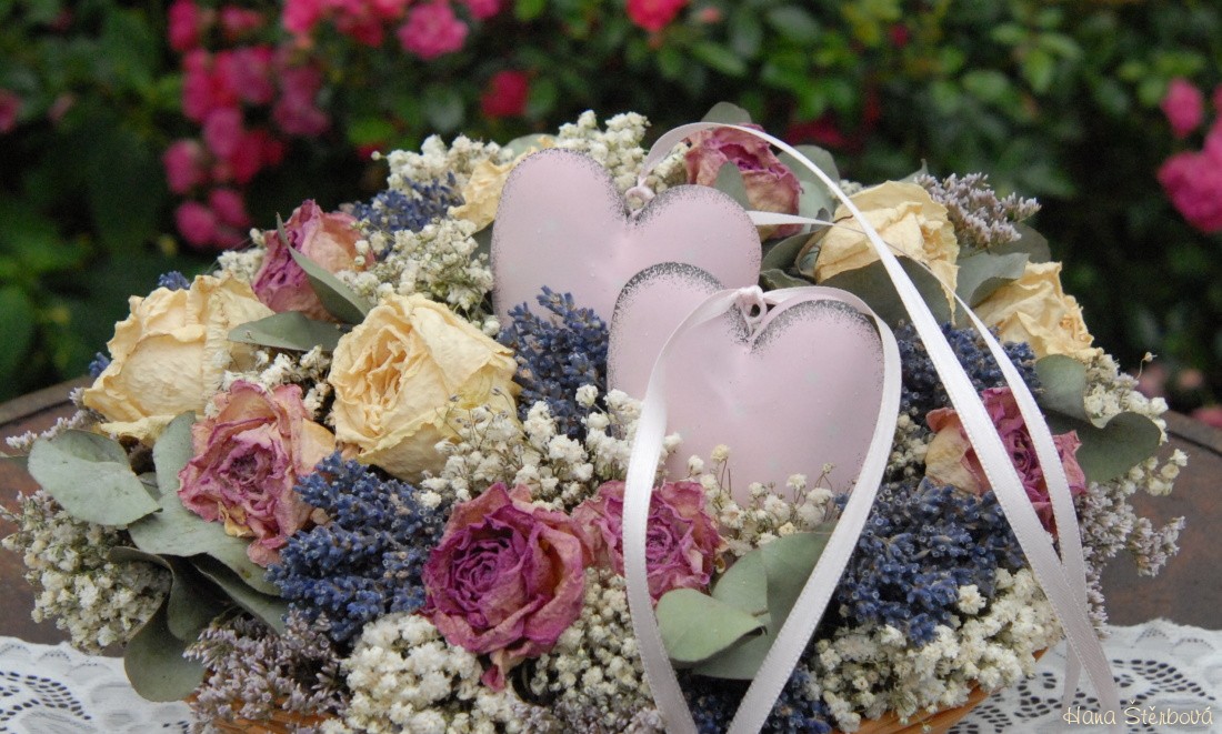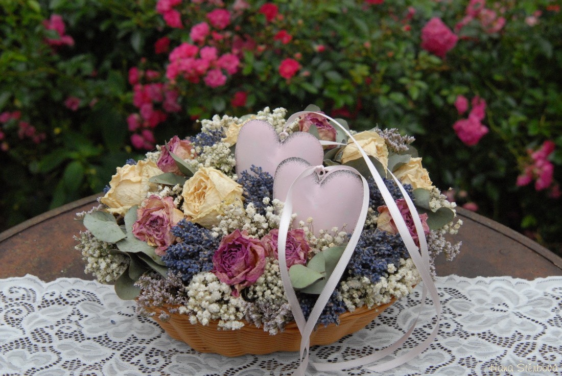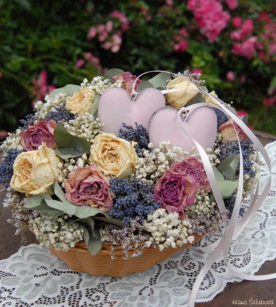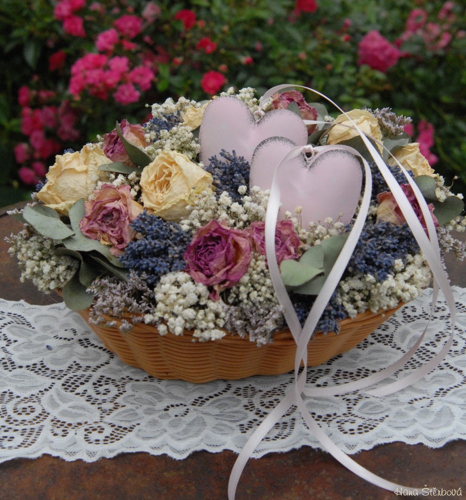 Košík se sušenými květinami a srdíčky