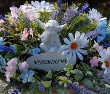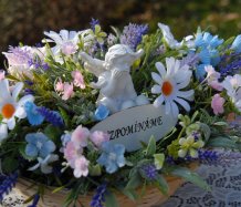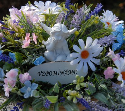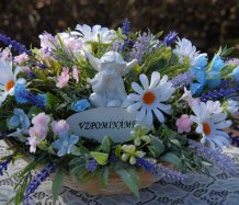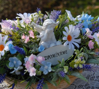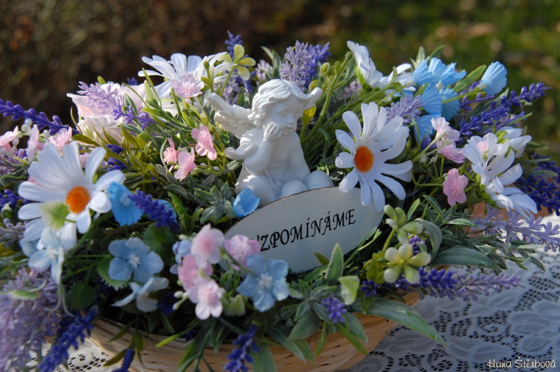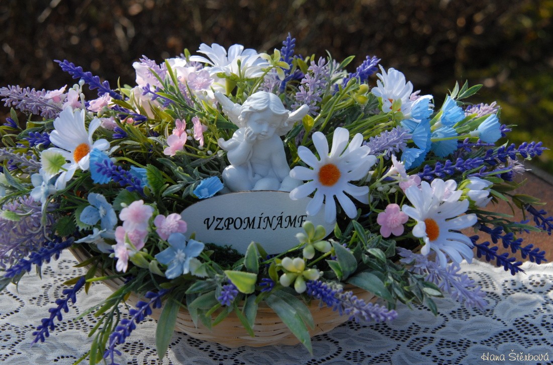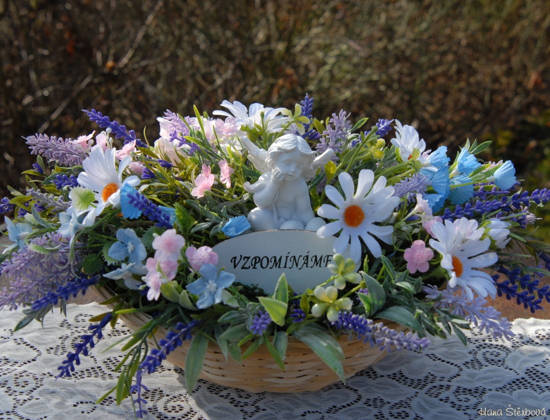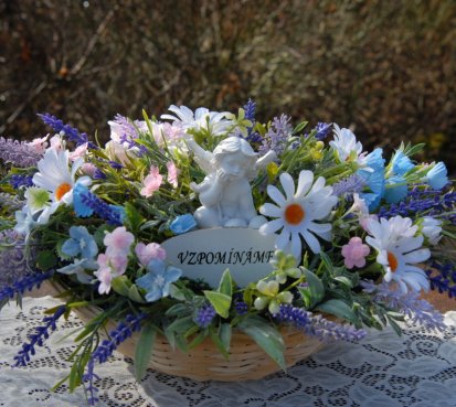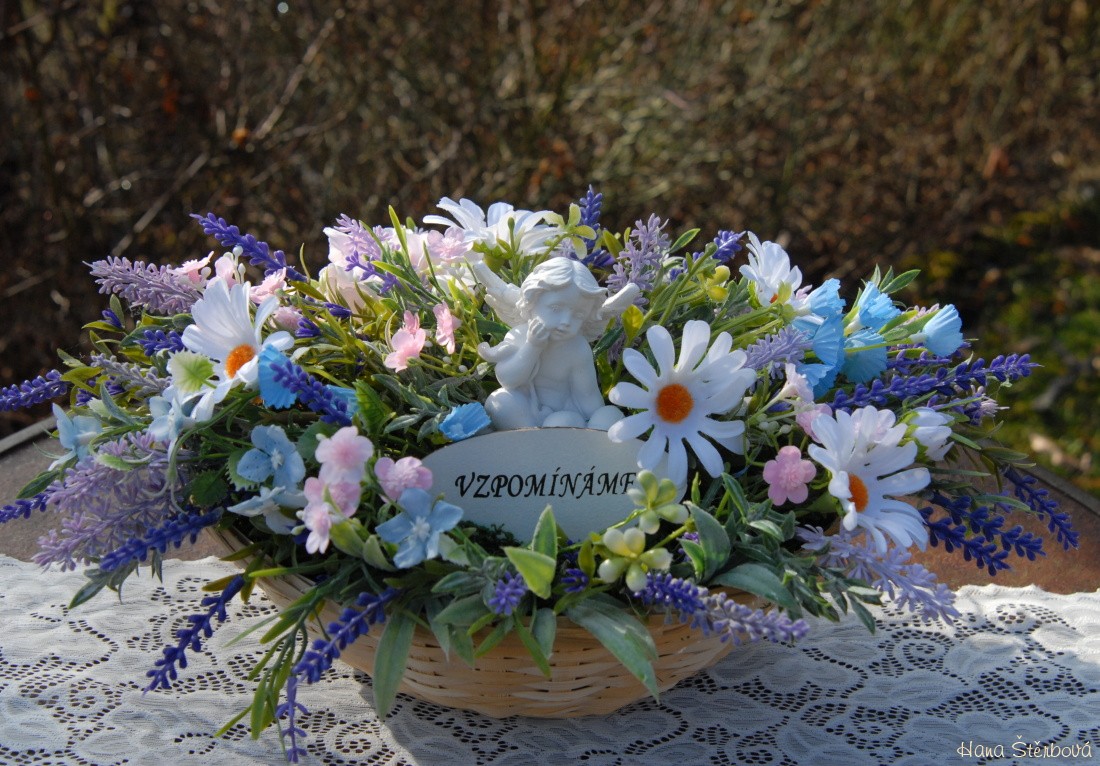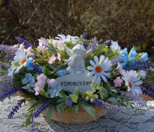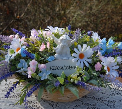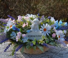 Velká dekorace z dokonalých umělých květin je naaranžována do košíku....krásný anděl k tomu