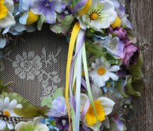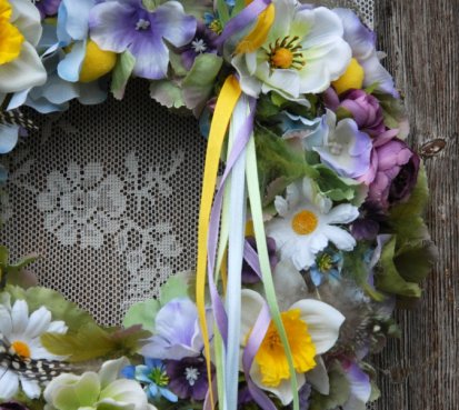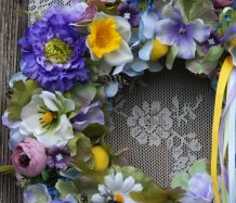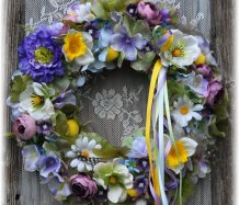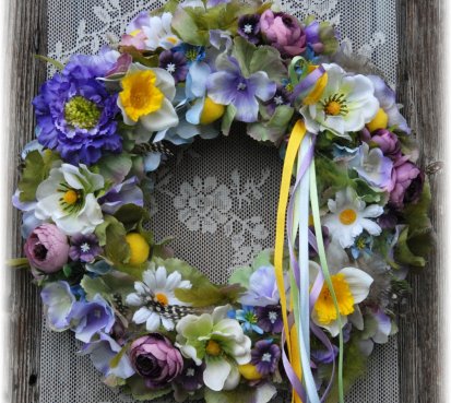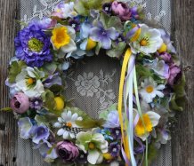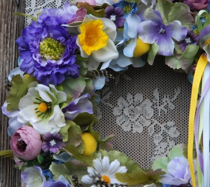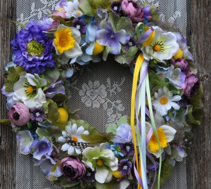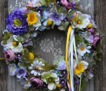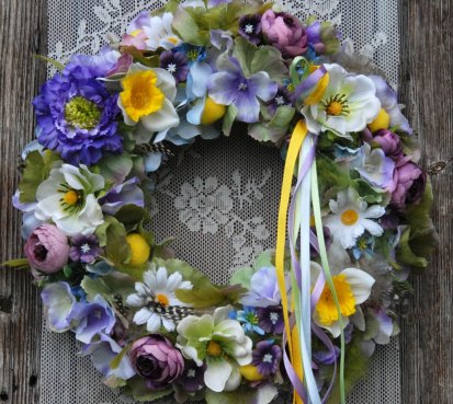 Věnec je vytvořen na pevném podkladu, bohatě zdoben dokonalými umělými květinami