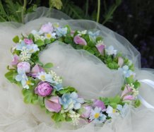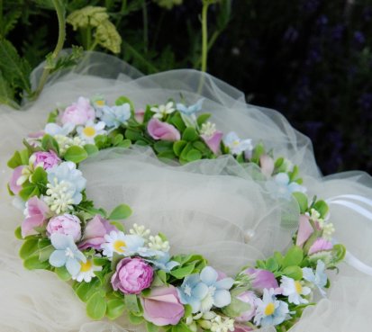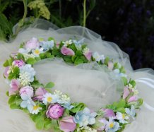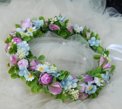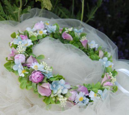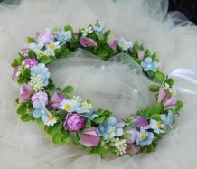 Věneček je umotán z dokonalých umělých a látkových květin....zavazování na stuhy, možno i jako svatební