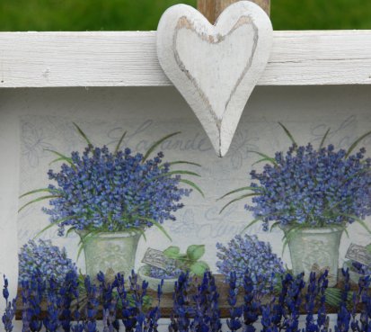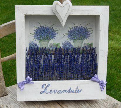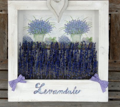 Hrubě opracovaný trojrozměrný rám je bohatě vyplněn sušenou levandulí, ozdoben dřevěným srdcem. Nevšední dekorace do Vašeho domova . Obraz můžete zavěsit, či položit