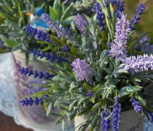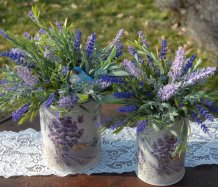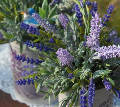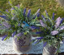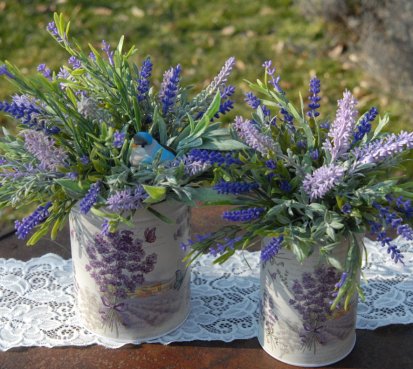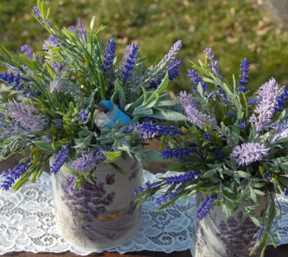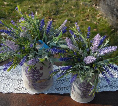 Krásná umělá levandule je naaranžována do dóz s motivem levandule.....roztomilý ptáček na vše dohlíží