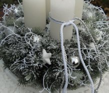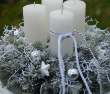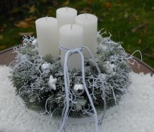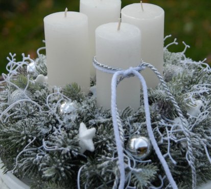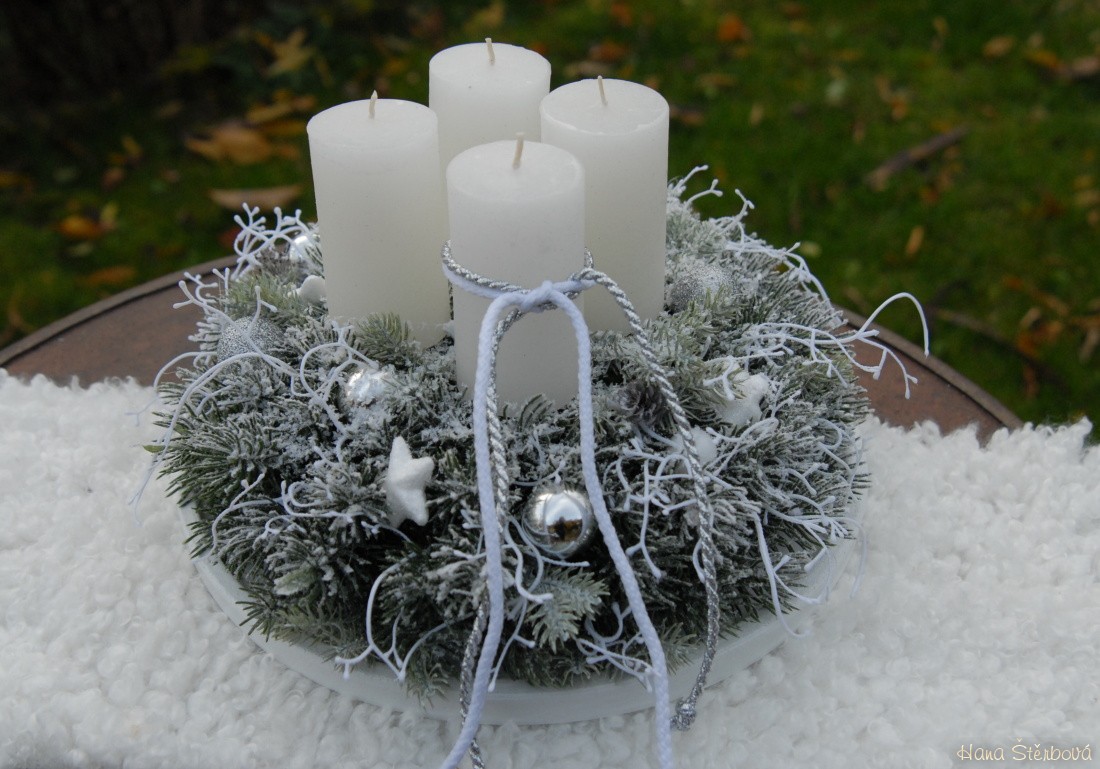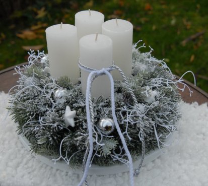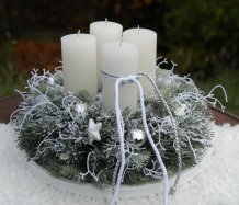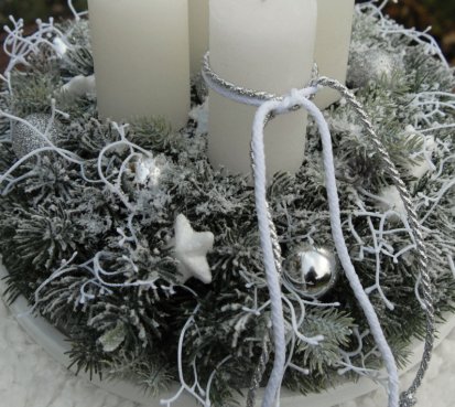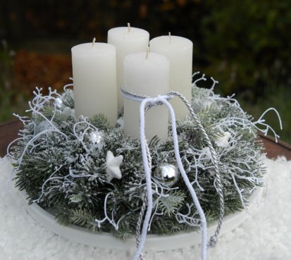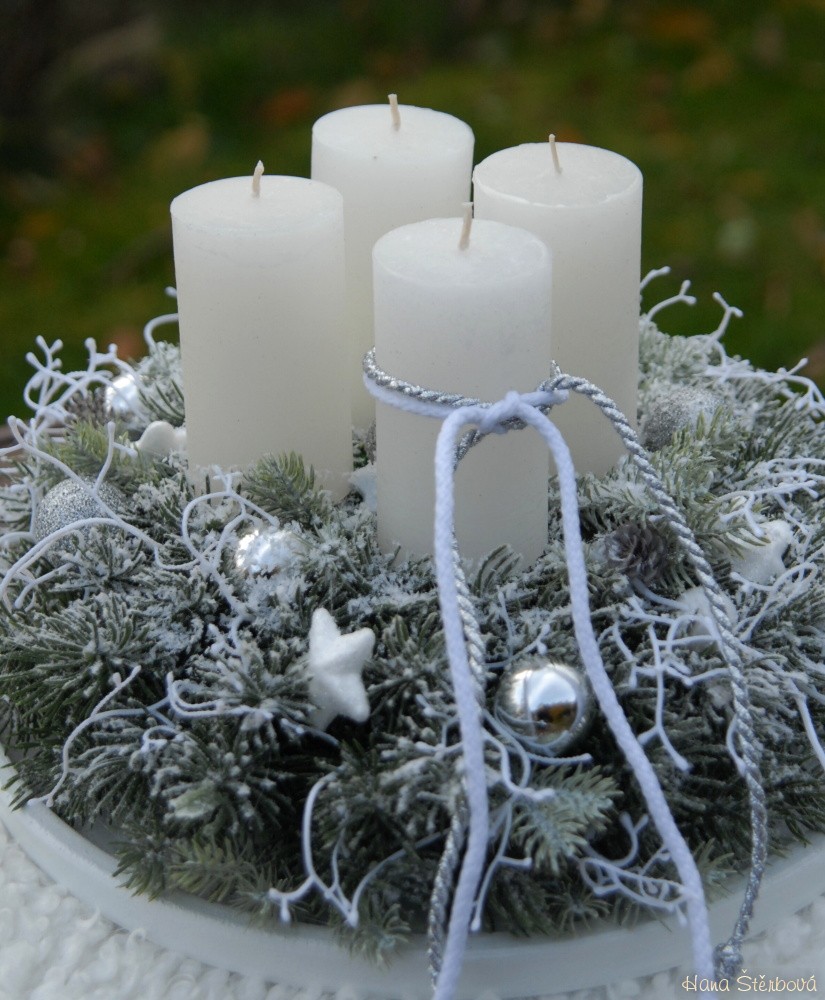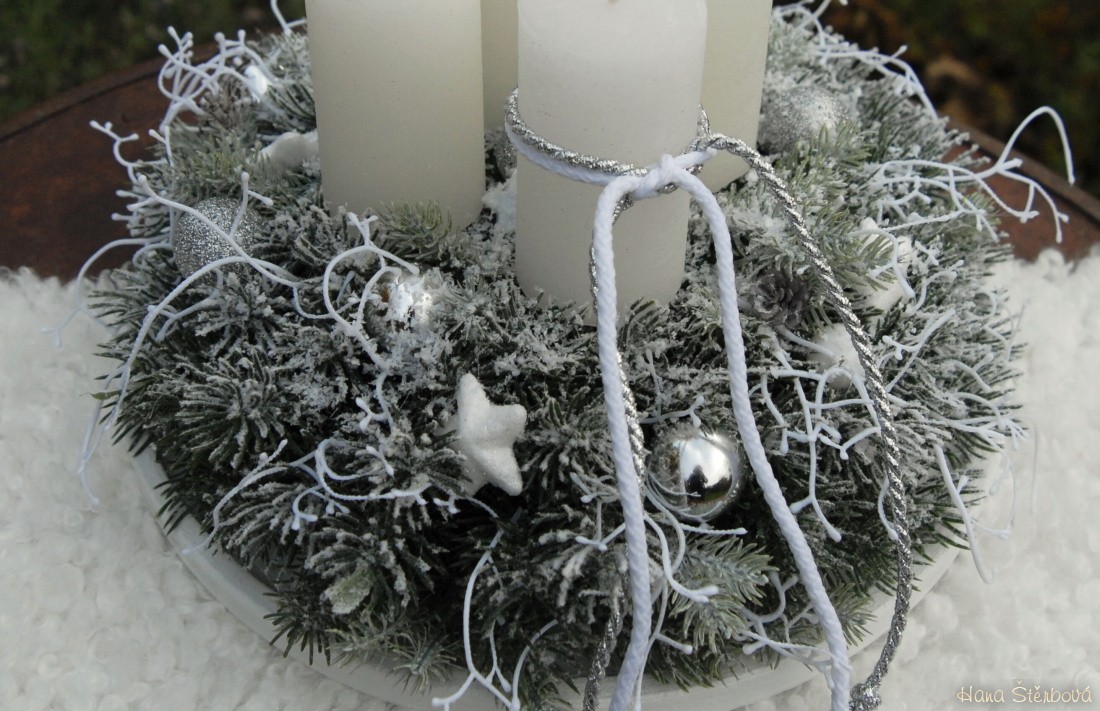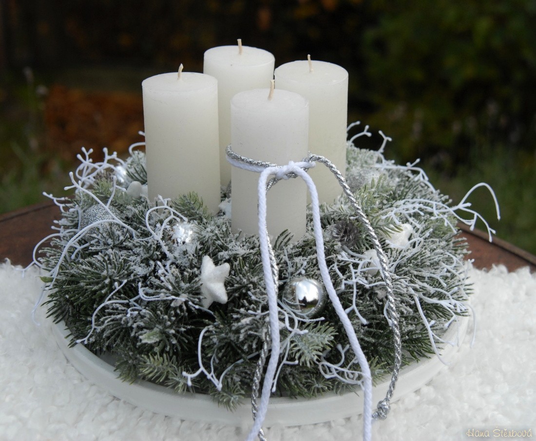 Mohutná dekorace z krásného umělého zasněženého jehličí s vánočními přízdobami na dřevěném podnosu