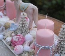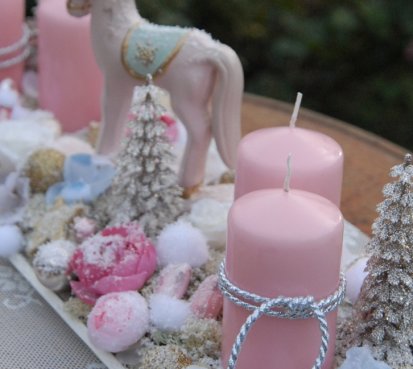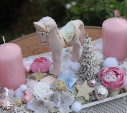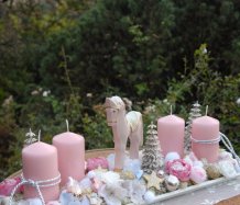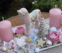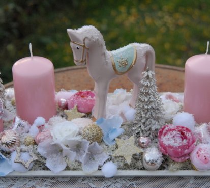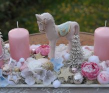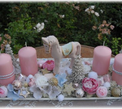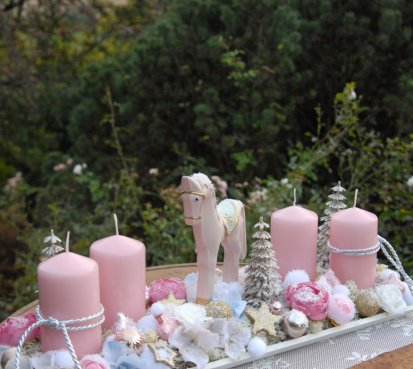 Velká adventní dekorace je naaranžována na dřevěném podnosu, bohatě zdobena vánočními přízdobami, stromečky..... svíčky jsou vyměnitelné na bezpečnostních bodcích....krásný růžový koník k tomu