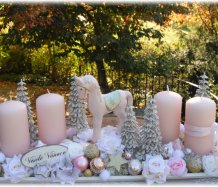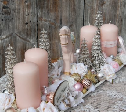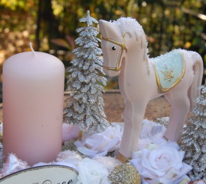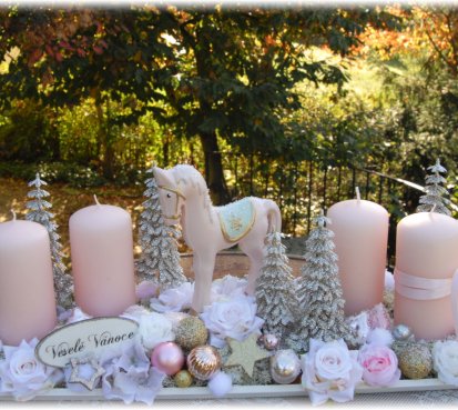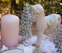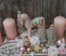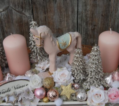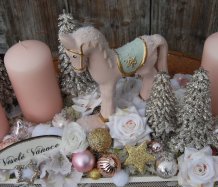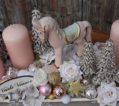 Veliká dekorace se spoustou vánočních přízdob je naaranžována na dřevěném tácu, svíčky na bezpečnostních bodcích jsou vyměnitelné.....krásný koník k tomu