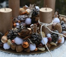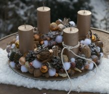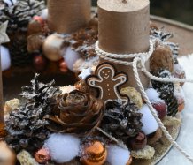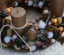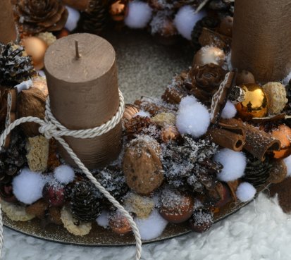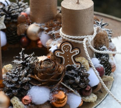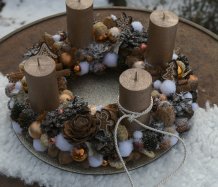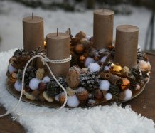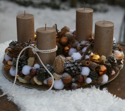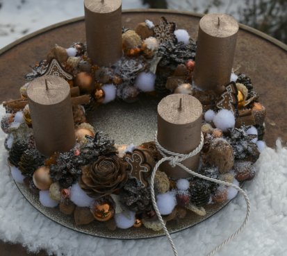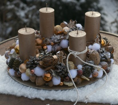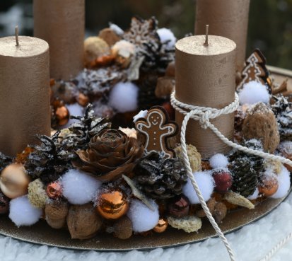 Luxusní hodně zdobený věnec vánočními přízdobami na zlatém podnosu...Svíčky na bezpečnostních bodcích jsou vyměnitelné