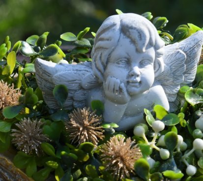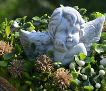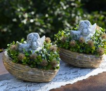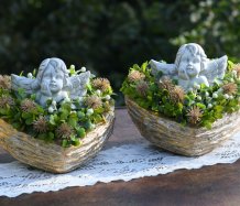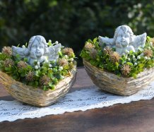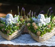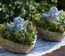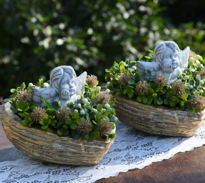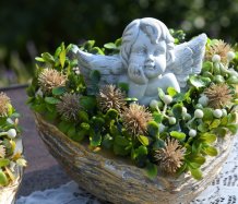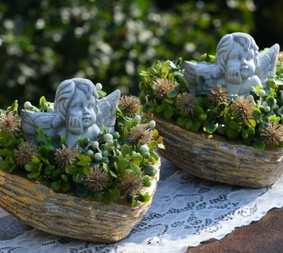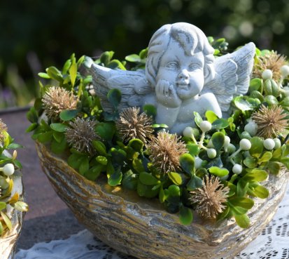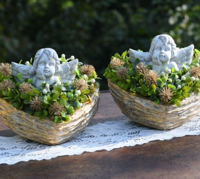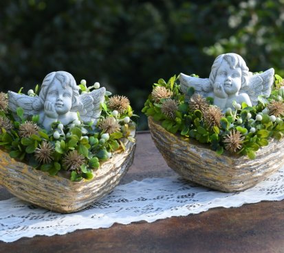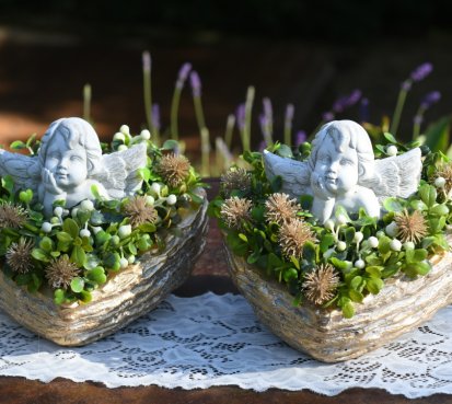 Dekorace s dokonalými umělými květinami a krásným andělem je naaranžována do těžkého betonového srdce se zlatou patinou