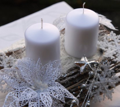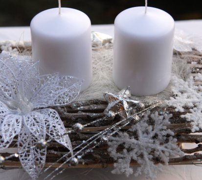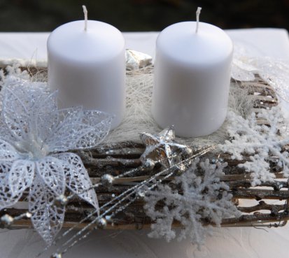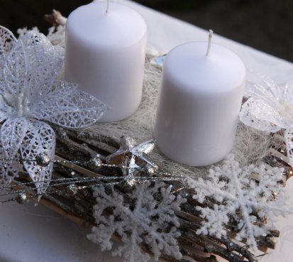 Luxusní vánoční dekorace ze zmrzlého proutí, ozdobena dvěma luxusními svíčkami, květy vánoční hvězdy se zmrzlým efektem... Pro náročné