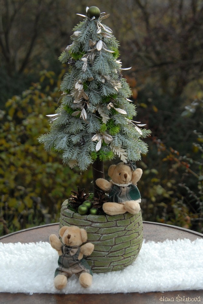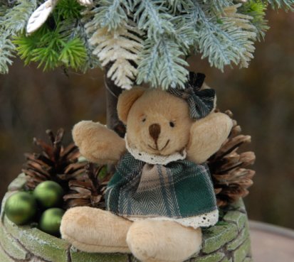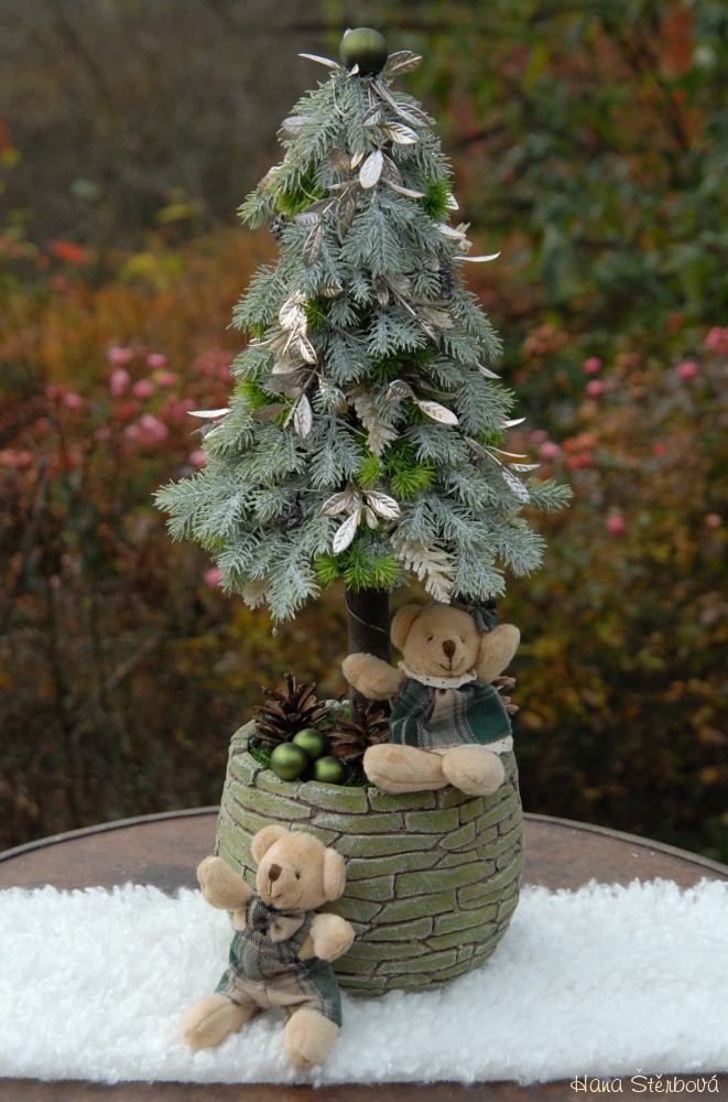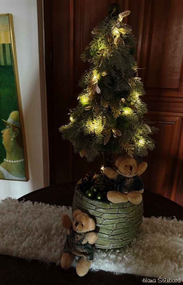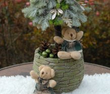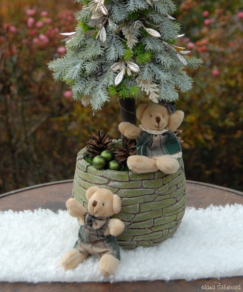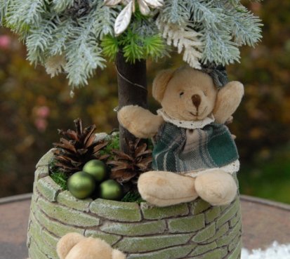 Veliký vánoční stromeček je vytvořen z dokonalých umělých jehličnanů, zasazen do krásné keramické nádoby a opatřen led světýlky....dva krásní plyšáčci k tomu
