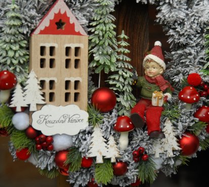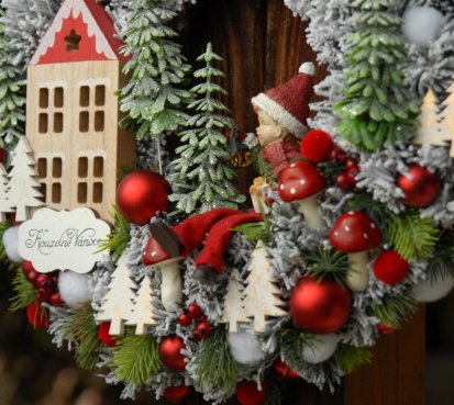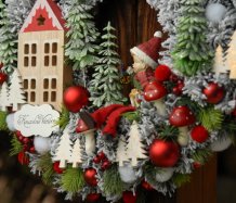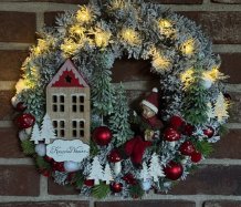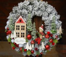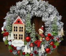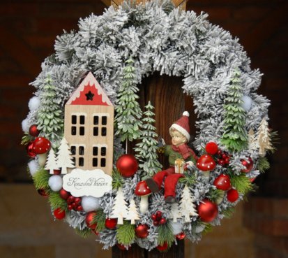 Veliký luxusní věnec z umělého zasněženého jehličí je ozdoben dřevěným domečkem, krásnou figurou z polyresinu, vánočními přízdobami a led světýlky