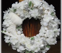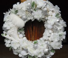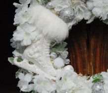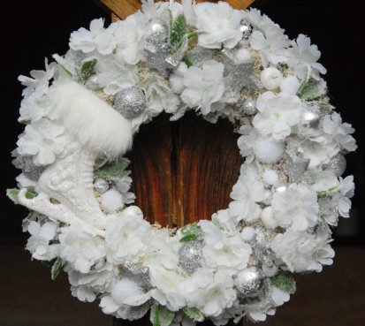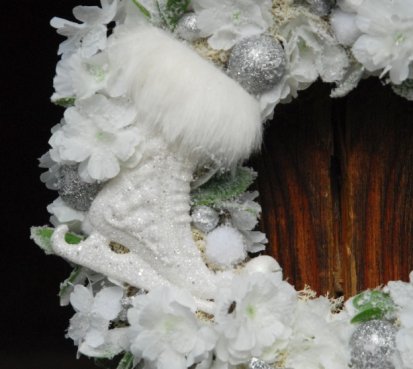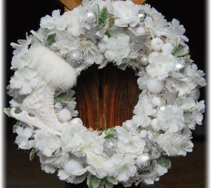 Bohatě zdobený věnec krásnými látkovými květinami a kouličkami.....krásná bruslička k tomu