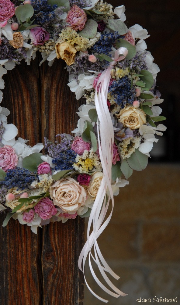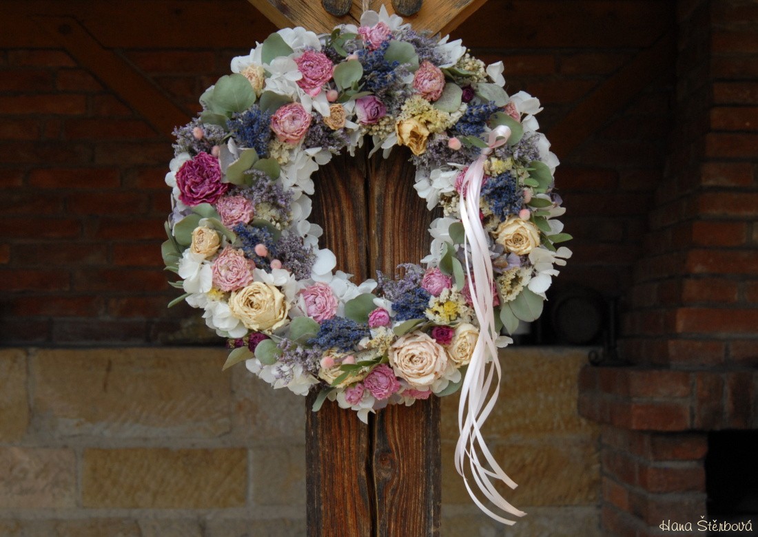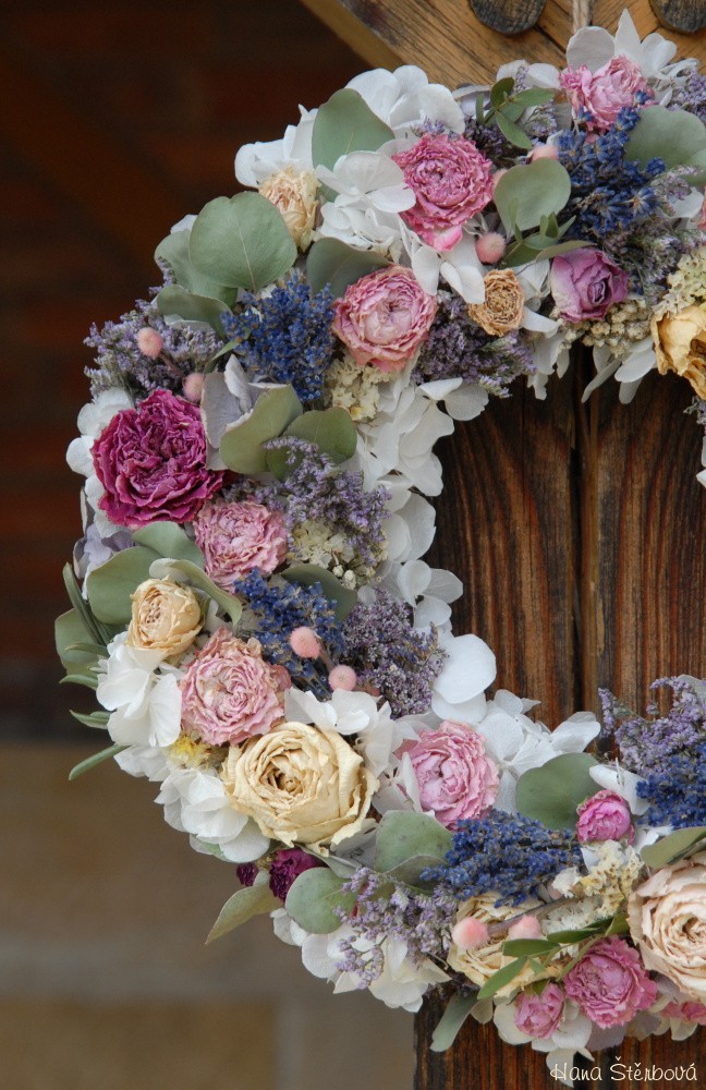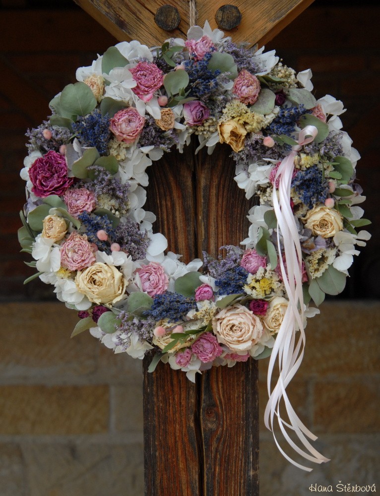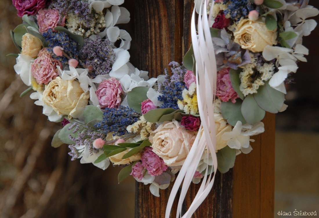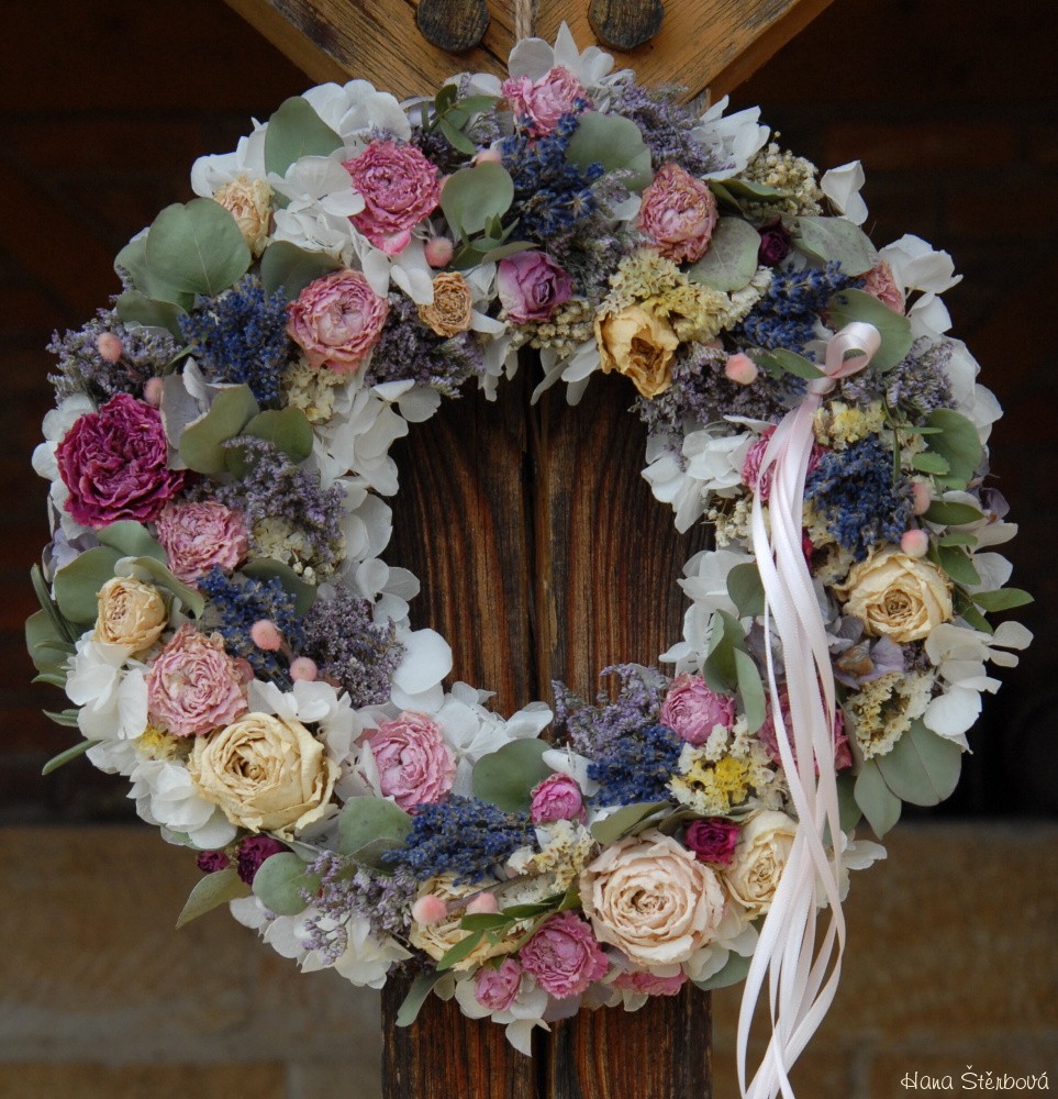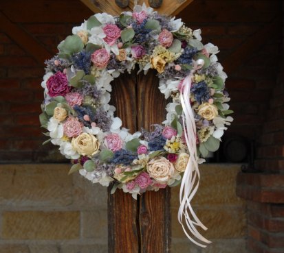 Velký voňavý věnec je bohatě zdoben krásnými sušenými květinami