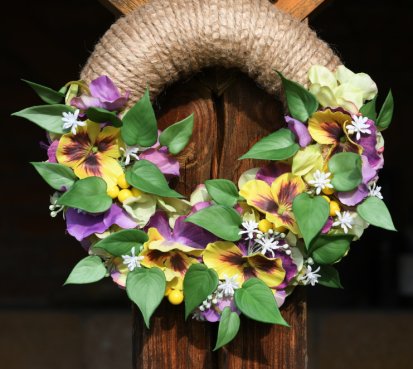Bohatě zdobený věnec dokonalými látkovými květinami
