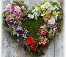 Pevné mechové srdce je ozdobeno dokonalými umělými květinami...