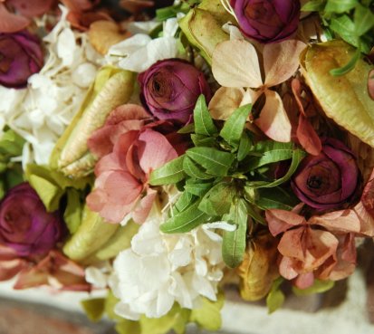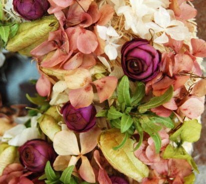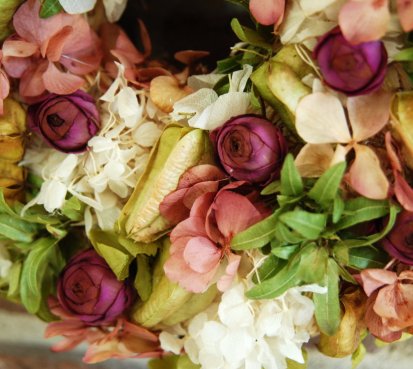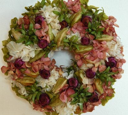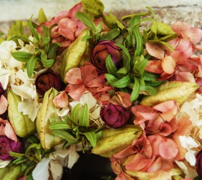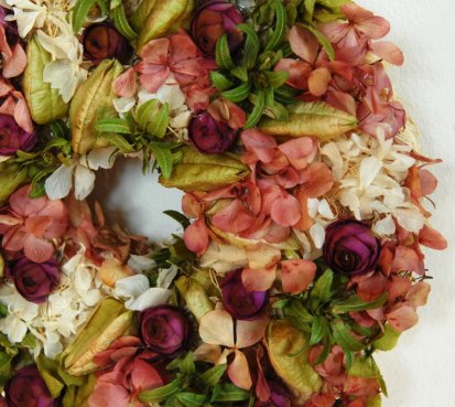 Krásný věnec ze sušených květin se bude dobře hodit do romantického interiéru.