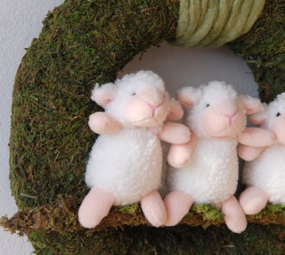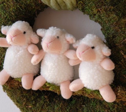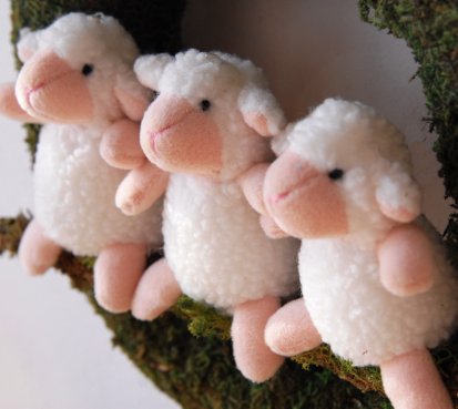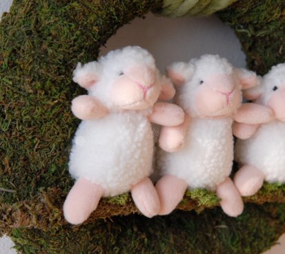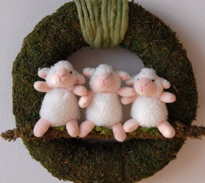 Mechový věnec ozdoben plyšovými ovečkami a dredy vlnou.