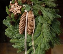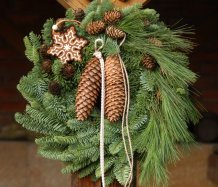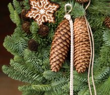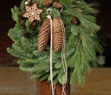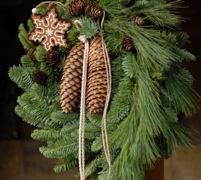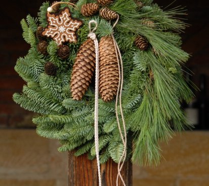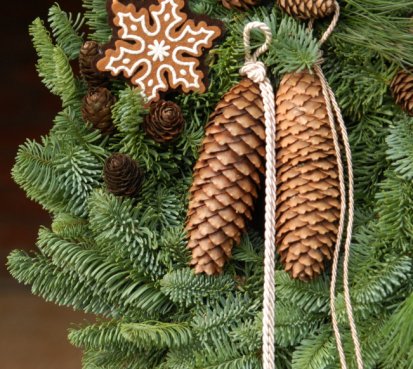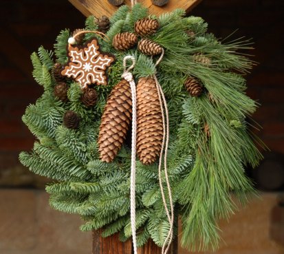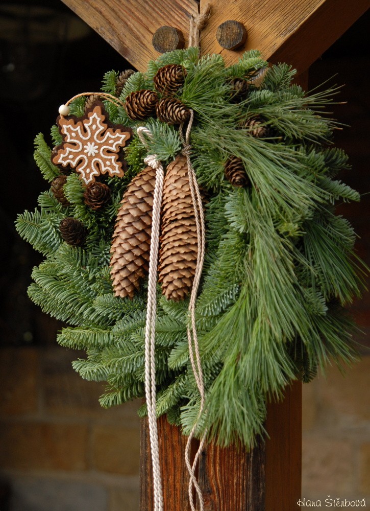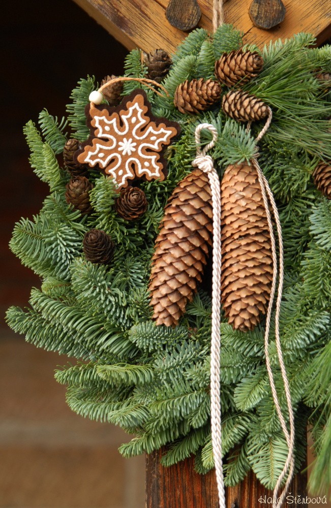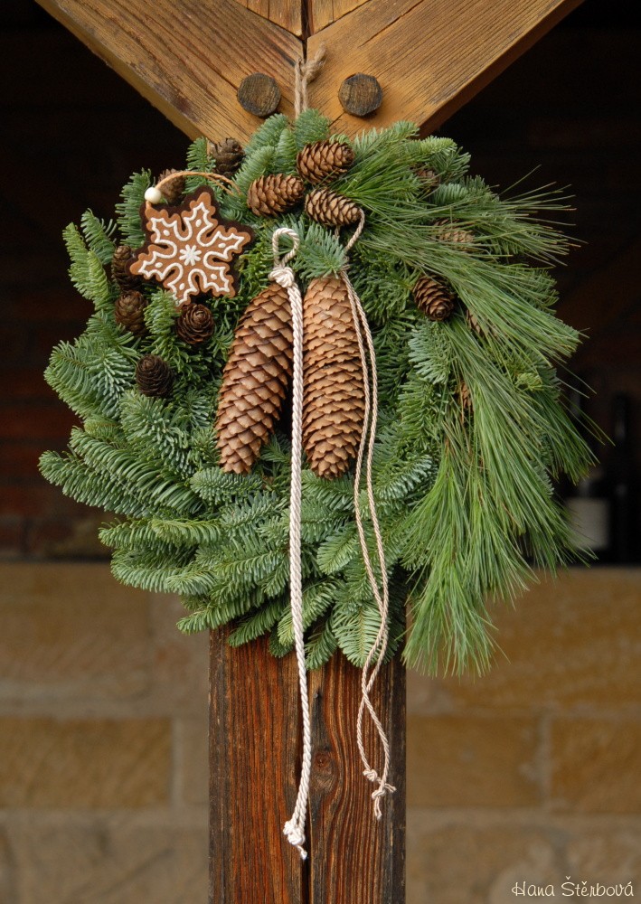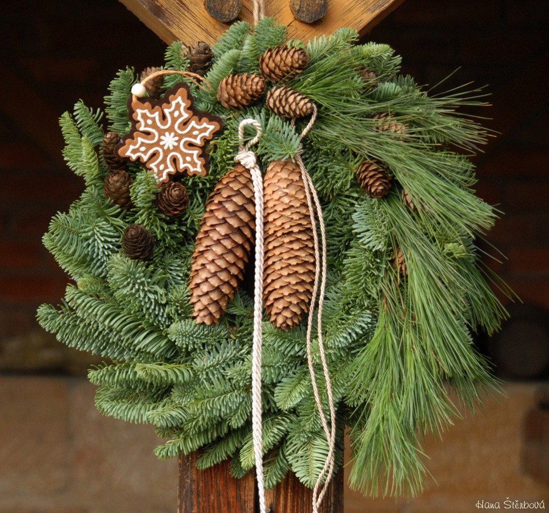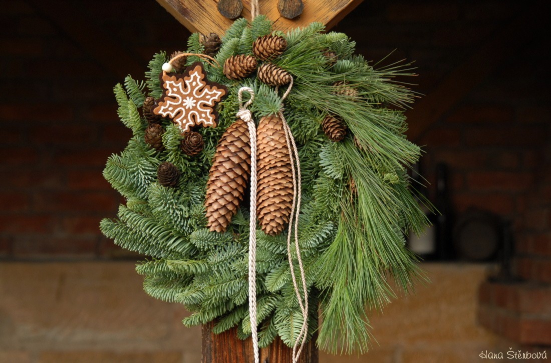 Mohutný věnec z čerstvé jedle Nobilis a borovice Vejmutovky je ozdoben přírodninami a perníčky z filcu