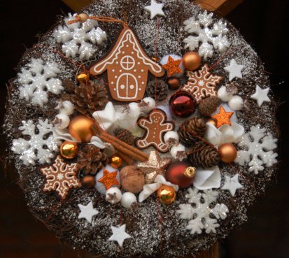 Velký věnec z jemného proutíčka bohatě zdoben dokonalými umělými perníčky, vánočními přízdobami