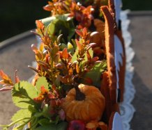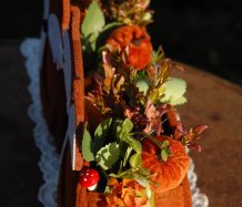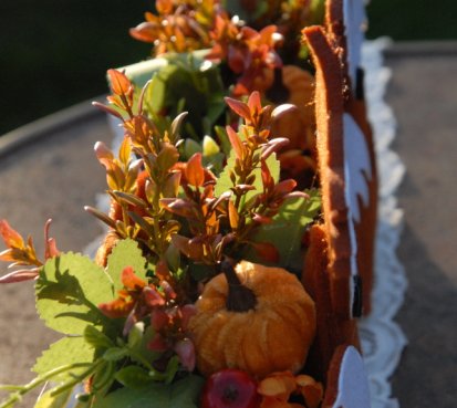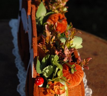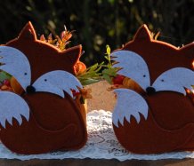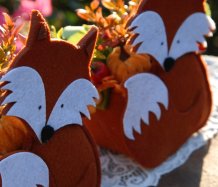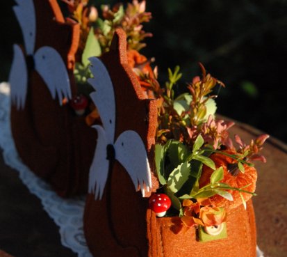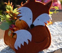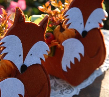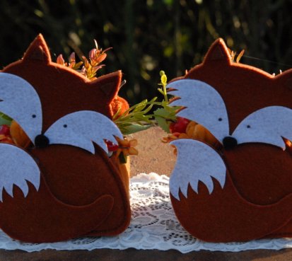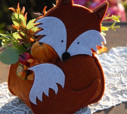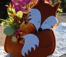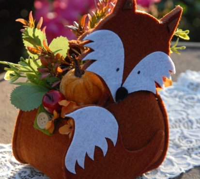 Krásná liška vytvořena z filcu, je naaranžována dokonalými umělými květinami a plody