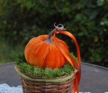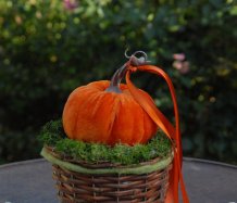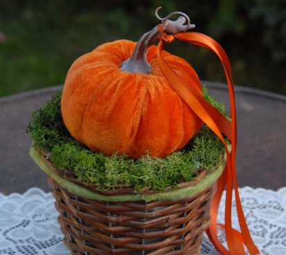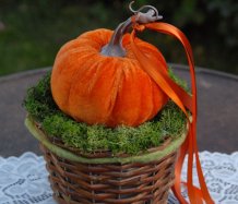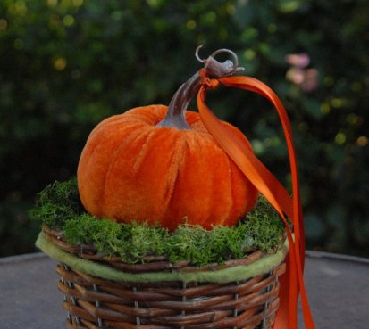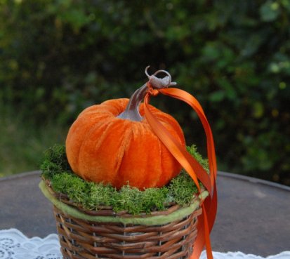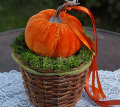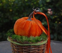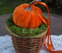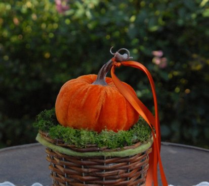 Krásná sametová dýně je naaranžována do proutěného košíku
