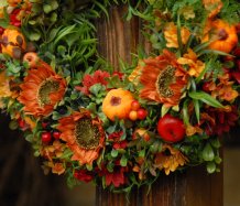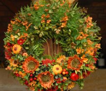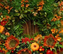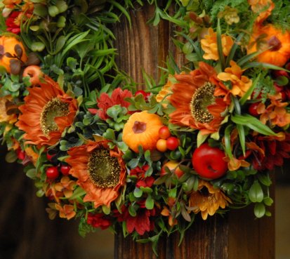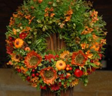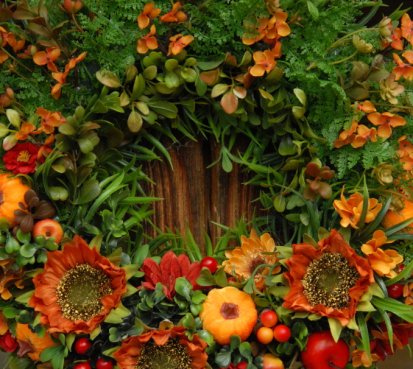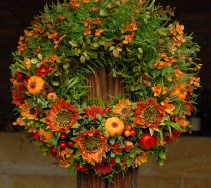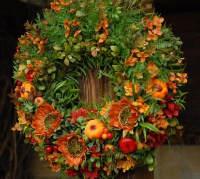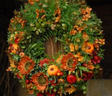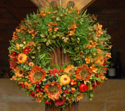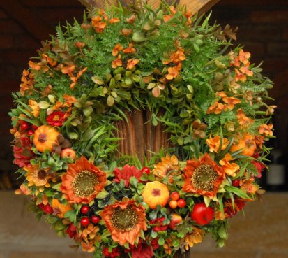 Veliký mohutný věnec je vytvořen z dokonalých umělých květin a plodů....