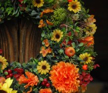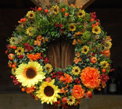 Velký mohutný věnec je vytvořen z dokonalých umělých květin a plodů....