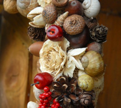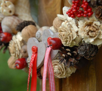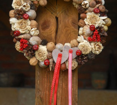 Krásný přírodní věnec ze sušených plodů s dřevěnými srdíčky