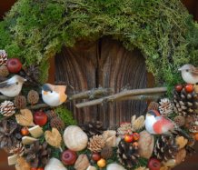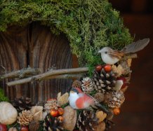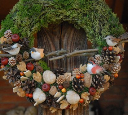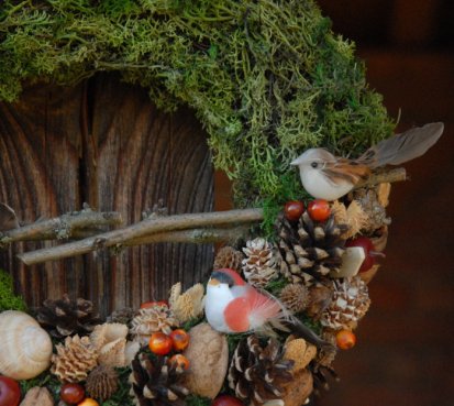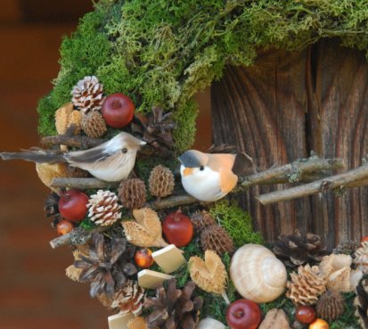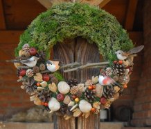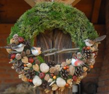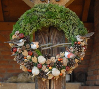 Věnec je vytvořen na pevném korpusu ze slámy, proutí a mechu...zdobeno přírodninami a roztomilými ptáčky