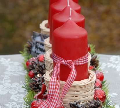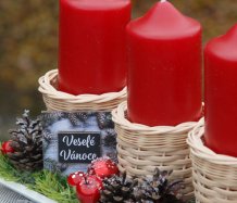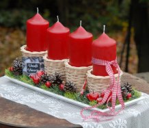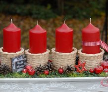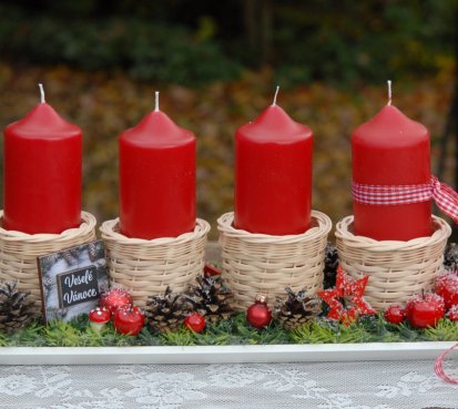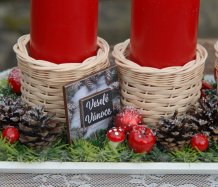 Velká adventní dekorace je vytvořena na dřevěném podnosu. V proutěných košíčcích jsou vyměnitelné svíčky na bezpečnostních bodcích. Dekorace je doplněna vánočními přízdobami a šiškami, cedulka je dřevěná
