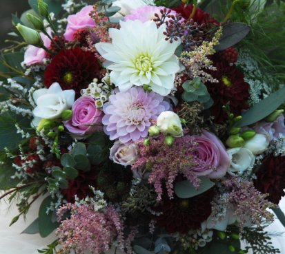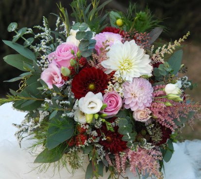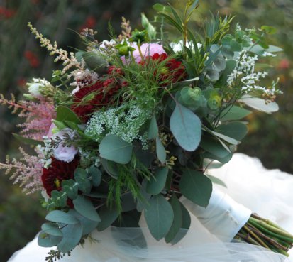 Svatební kytice z čerstvých růží, jiřin, ostružin, eucalyptu...