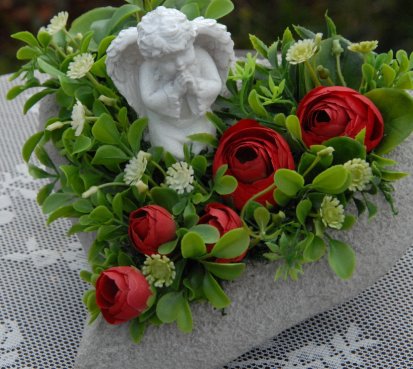 Betonové srdce je naaranžováno krásným andělem z polyresinu a dokonalými umělými květinami....dekorace je poměrně těžká, bude se hodit jako ozdoba na hrob