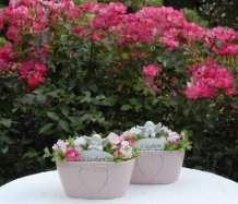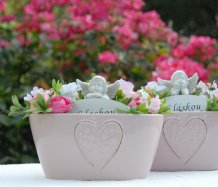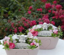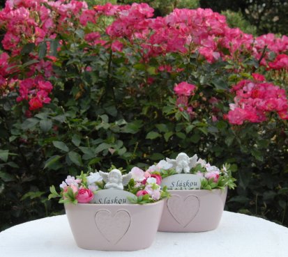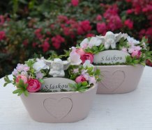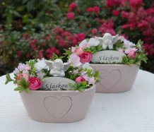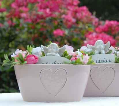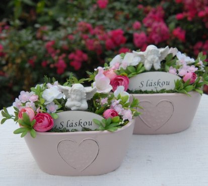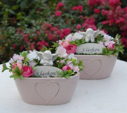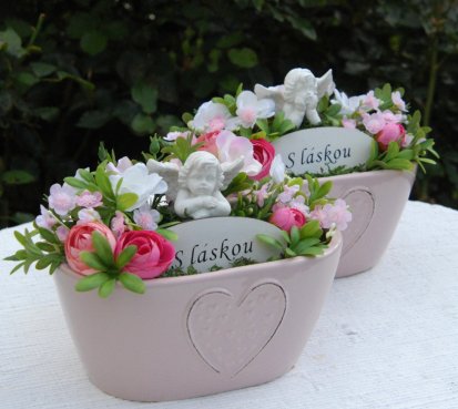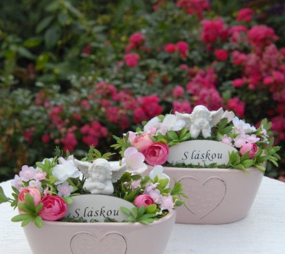 Dekorace z dokonalých umělých květin je naaranžována do krásné keramické nádoby...andělíček k tomu