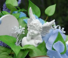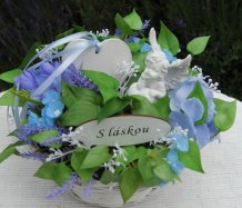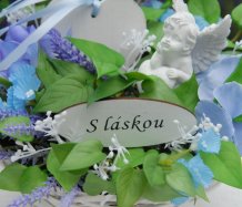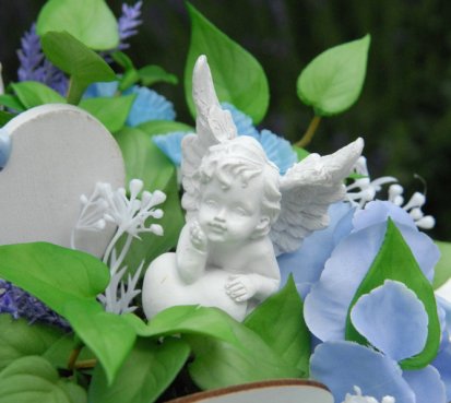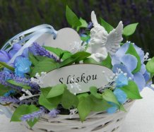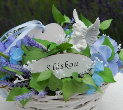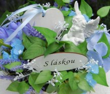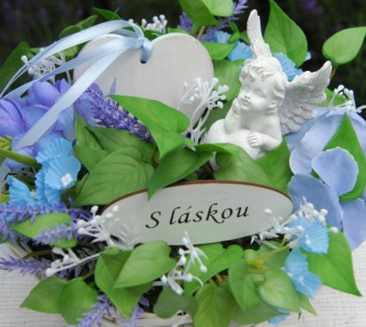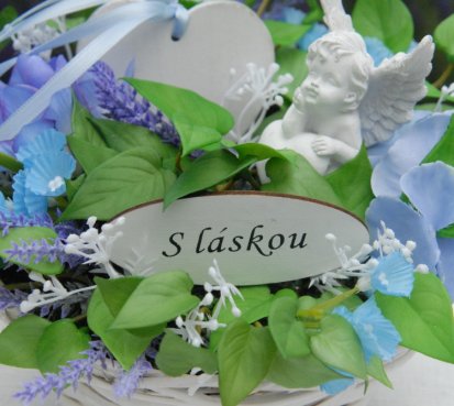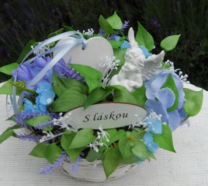 Dekorace je naaranžována do proutěného košíku s dokonalými umělými květinami, andělem, dřevěným srdcem a nápisem na destičce