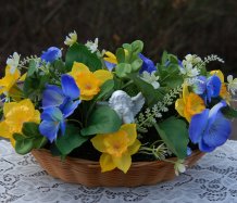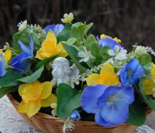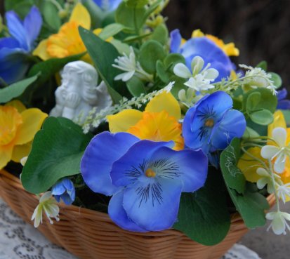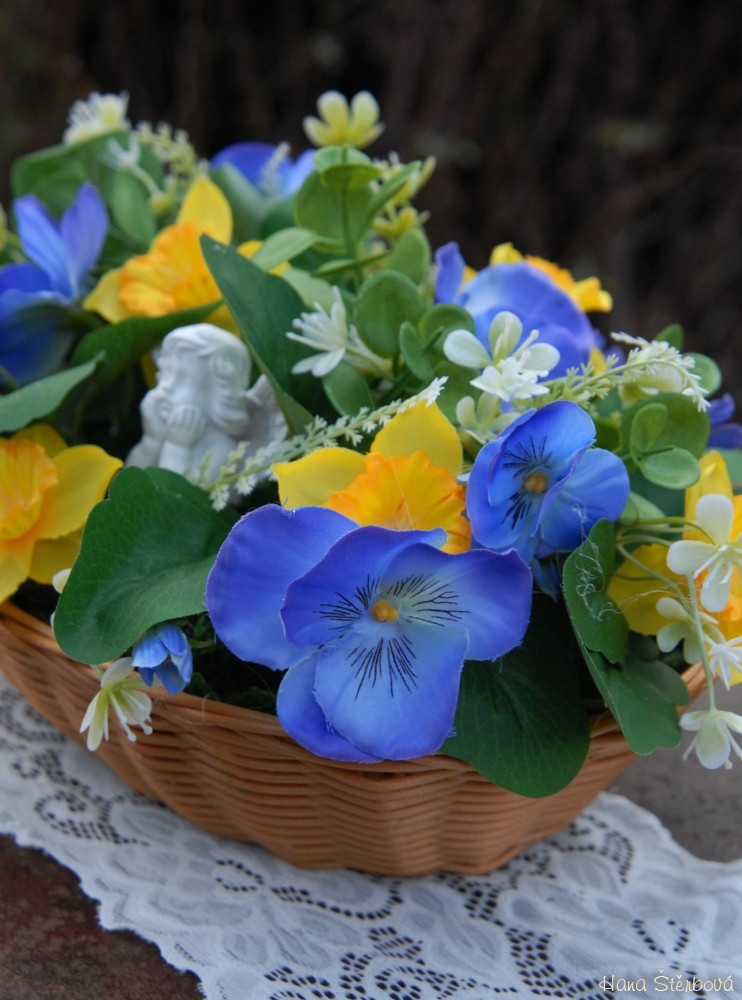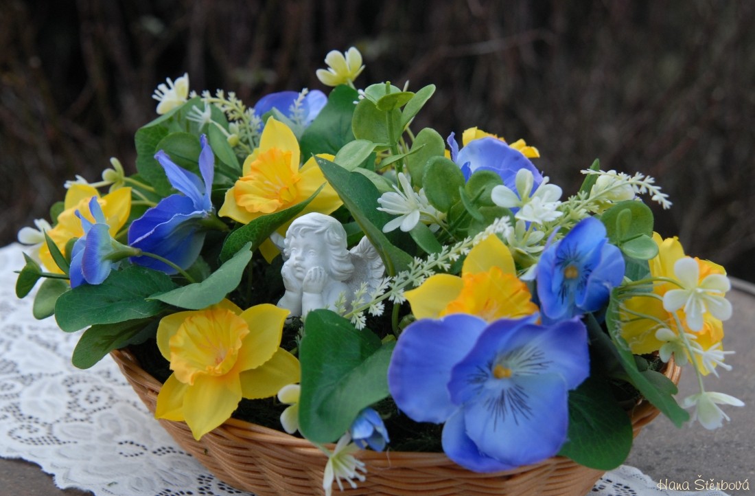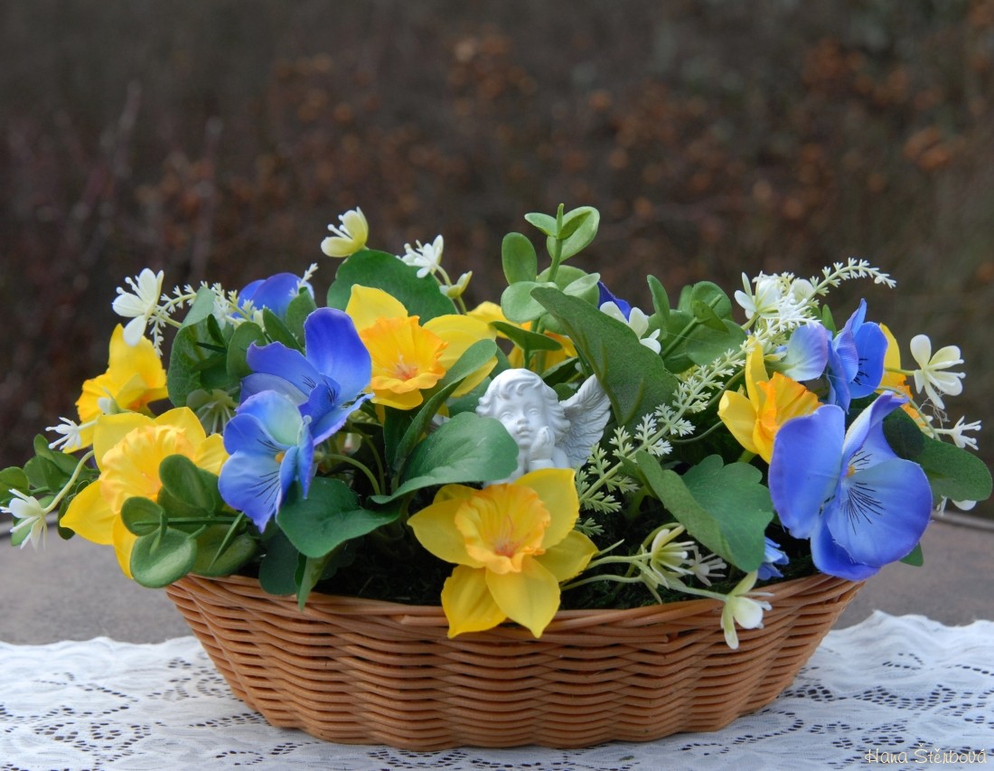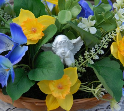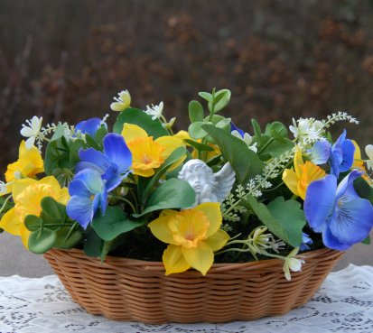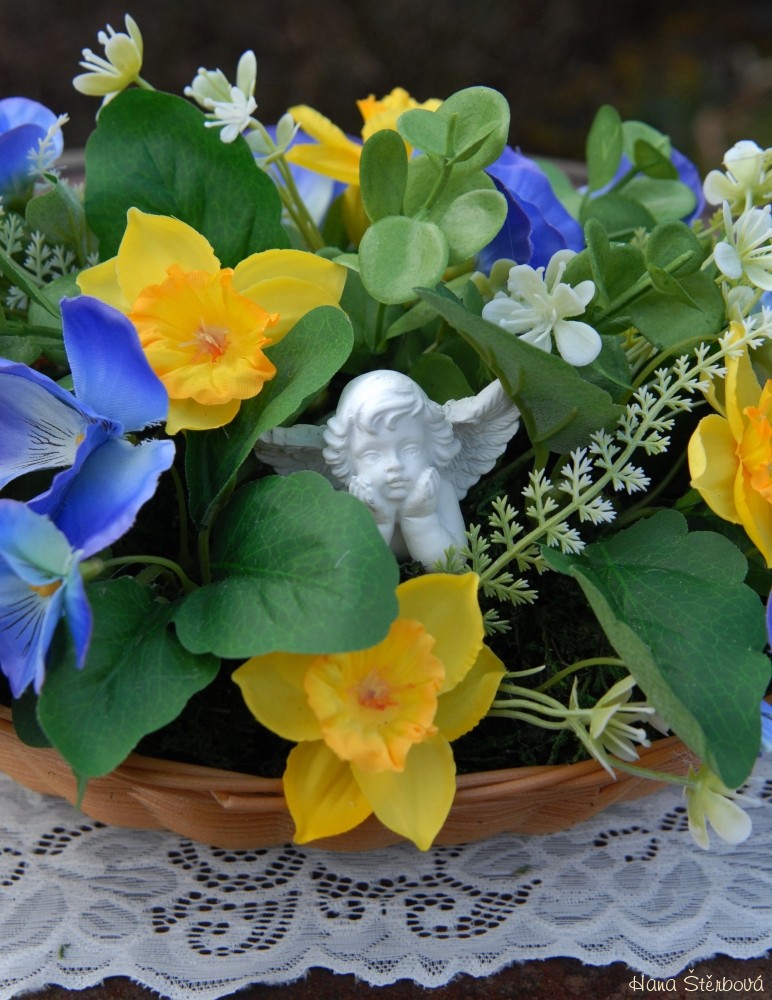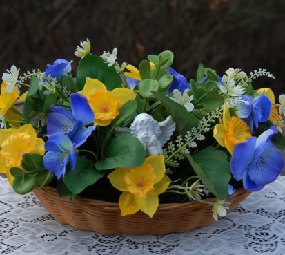 Dekorace z trvanlivých květin s krásným andílkem je naaranžována do košíku z plastu