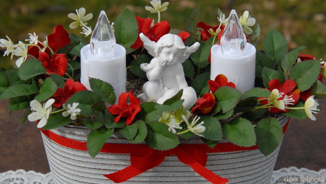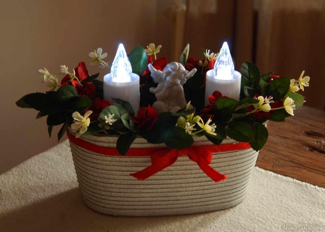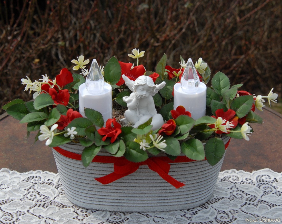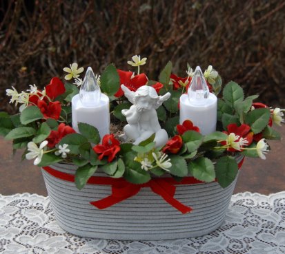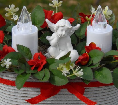 Dekorace je naaranžována do krásné plechové nádoby s umělými květinami a krásným andělem. Svíčky jsou na baterky, které jsou přiloženy...
