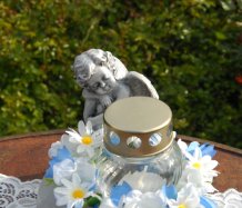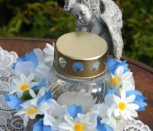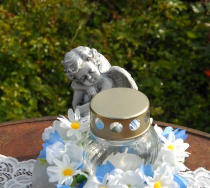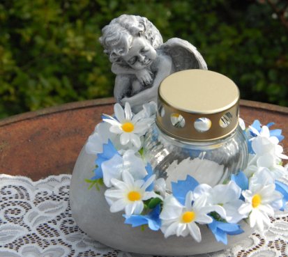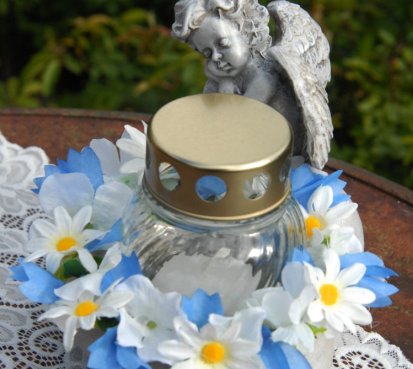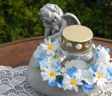 Srdce s andělem je vytvořeno z polyresinu, zdobené dokonalými umělými květinami...skleněný svícen s vyměnitelnou svíčkou