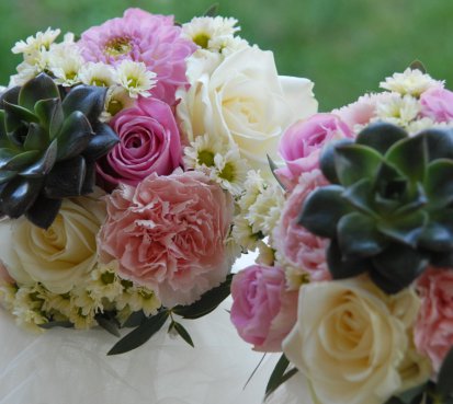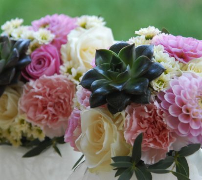 Svatební kytice pro maminky z čerstvých růží, jiřin, sukulentů...