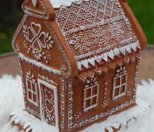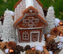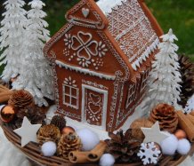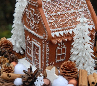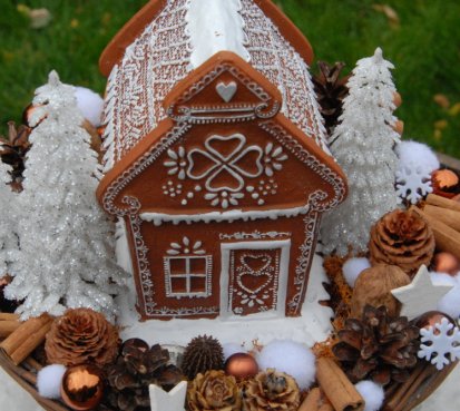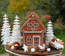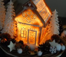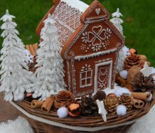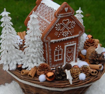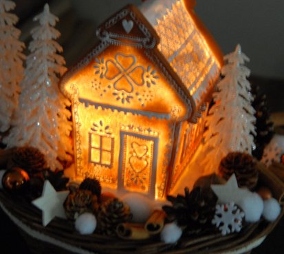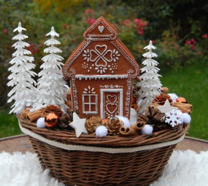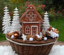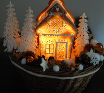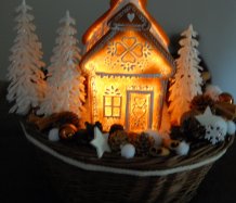 Bohatě zdobený proutěný košík a v něm krásná perníková svítící chaloupka z polyresinu....baterie jsou přiloženy
