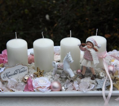 Dekorace je naaranžována na dřevěném podnosu, svíčky na bezpečnostním bodci jsou vyměnitelné....a k tomu roztomilá holčička s koníkem