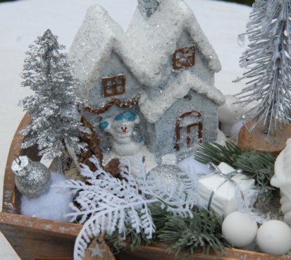 Dřevěná bedýnka je naaranžována volně stojícím domečkem, který v šeru krásně svítí....svíčka ve tvaru klubíčka na bezpečnostním bodci...vánoční přízdoby