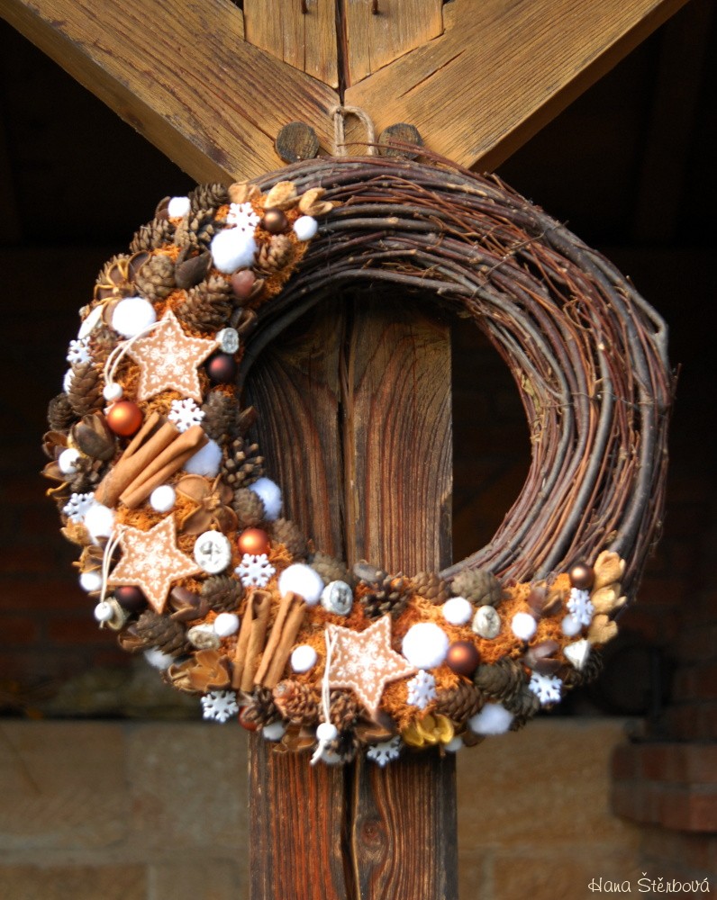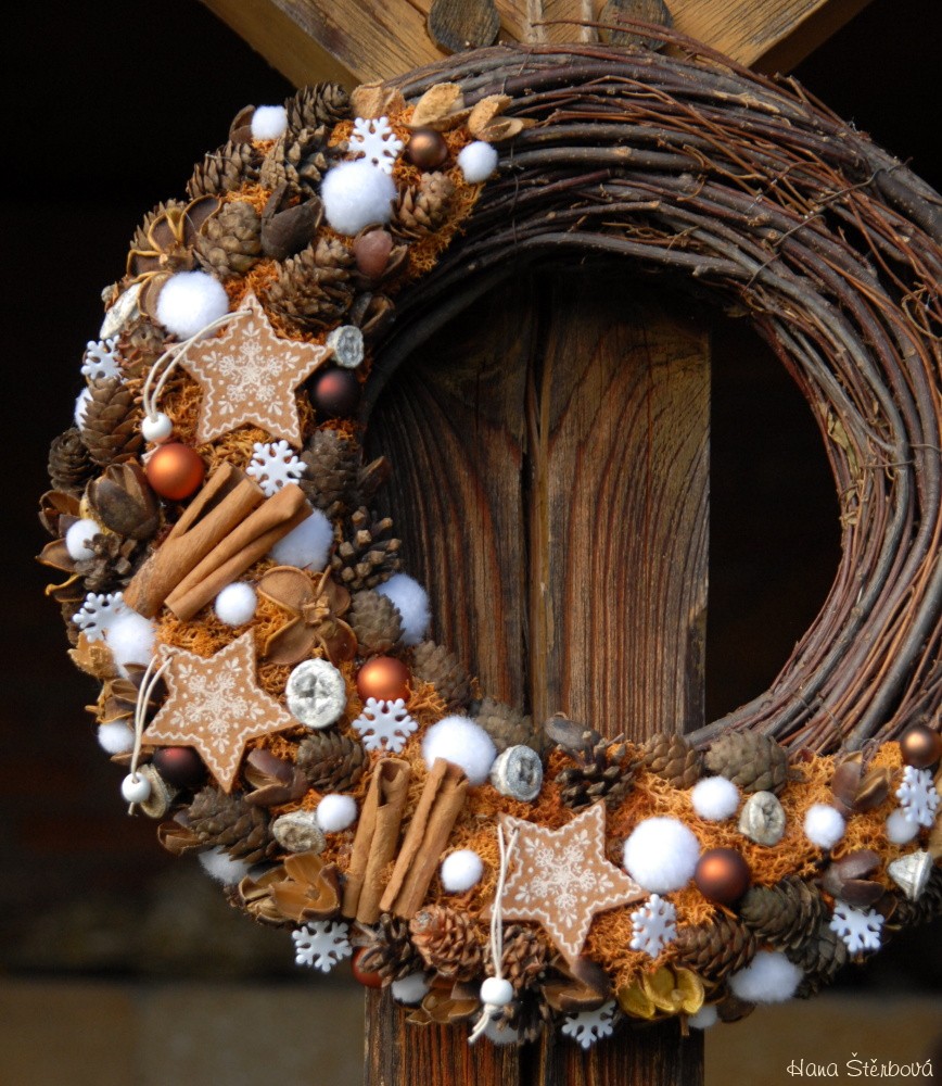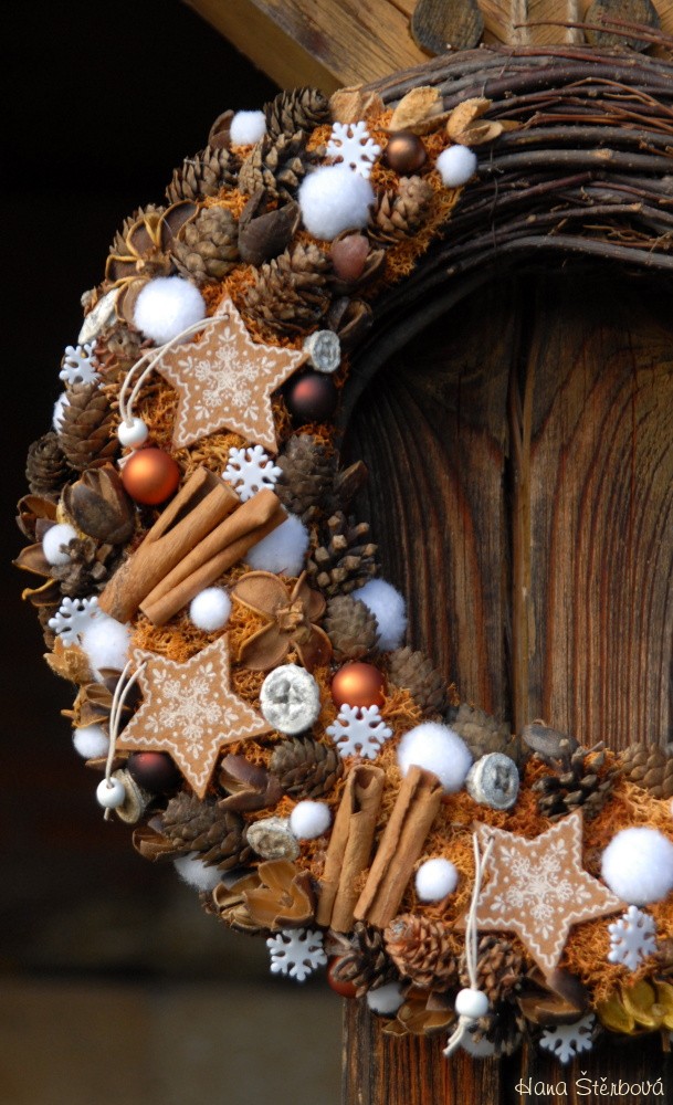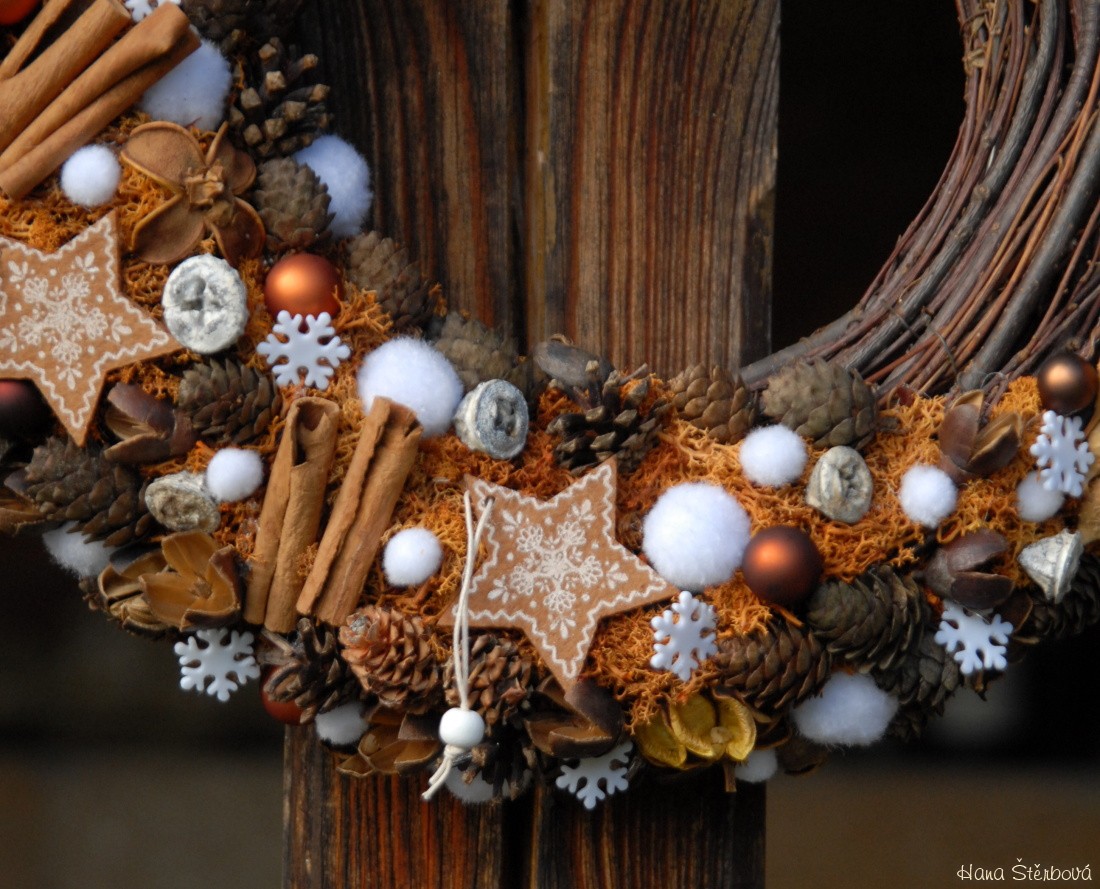 Korpus věnce je vytvořen z proutí, ozdoben vánočními přízdobami a přírodninami....krásné perníčky jsou z filcu