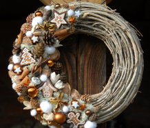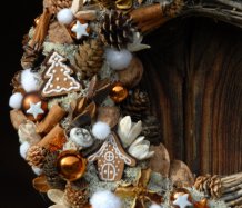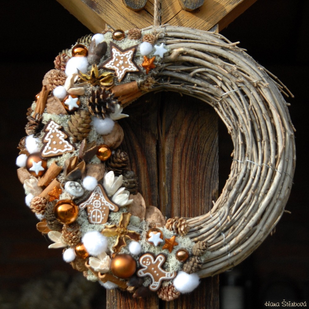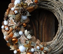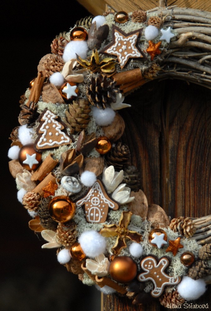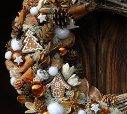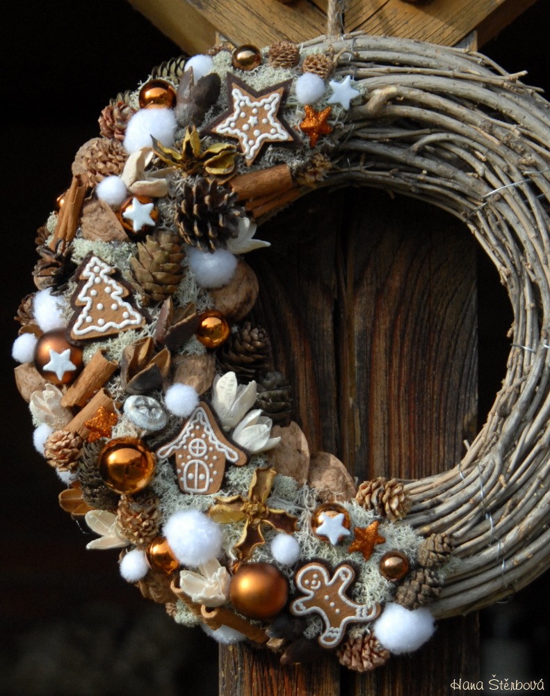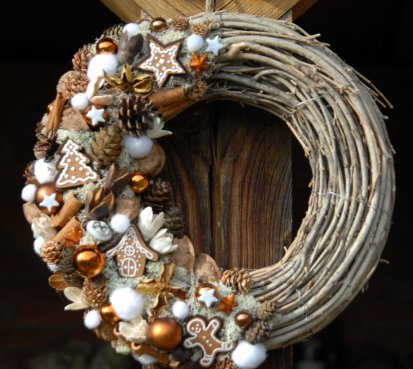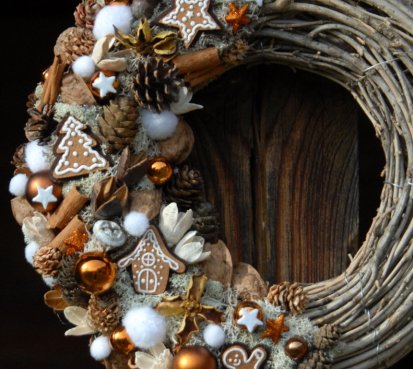 Bohatě zdobený věnec vánočními přízdobami a krásnými perníčky z filcu